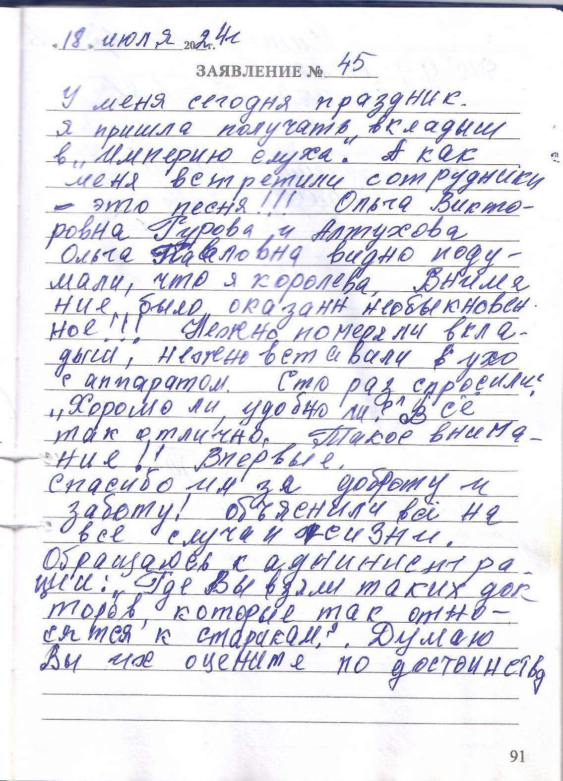 У меня сегодня праздник. Я пришла получать вкладыш в «Империю слуха». А как меня встретили сотрудники – это песня!!! Ольга Викторовна Гурова и Алтухова Ольга Павловна видно подумали, что я королева. Внимание было оказано необыкновенное!!! Нежно поменяли вкладыш, нежно вставили в ухо с аппаратом. Сто раз спросили: «Хорошо ли, удобно ли?» Всё так отлично. Такое внимание!! Впервые.