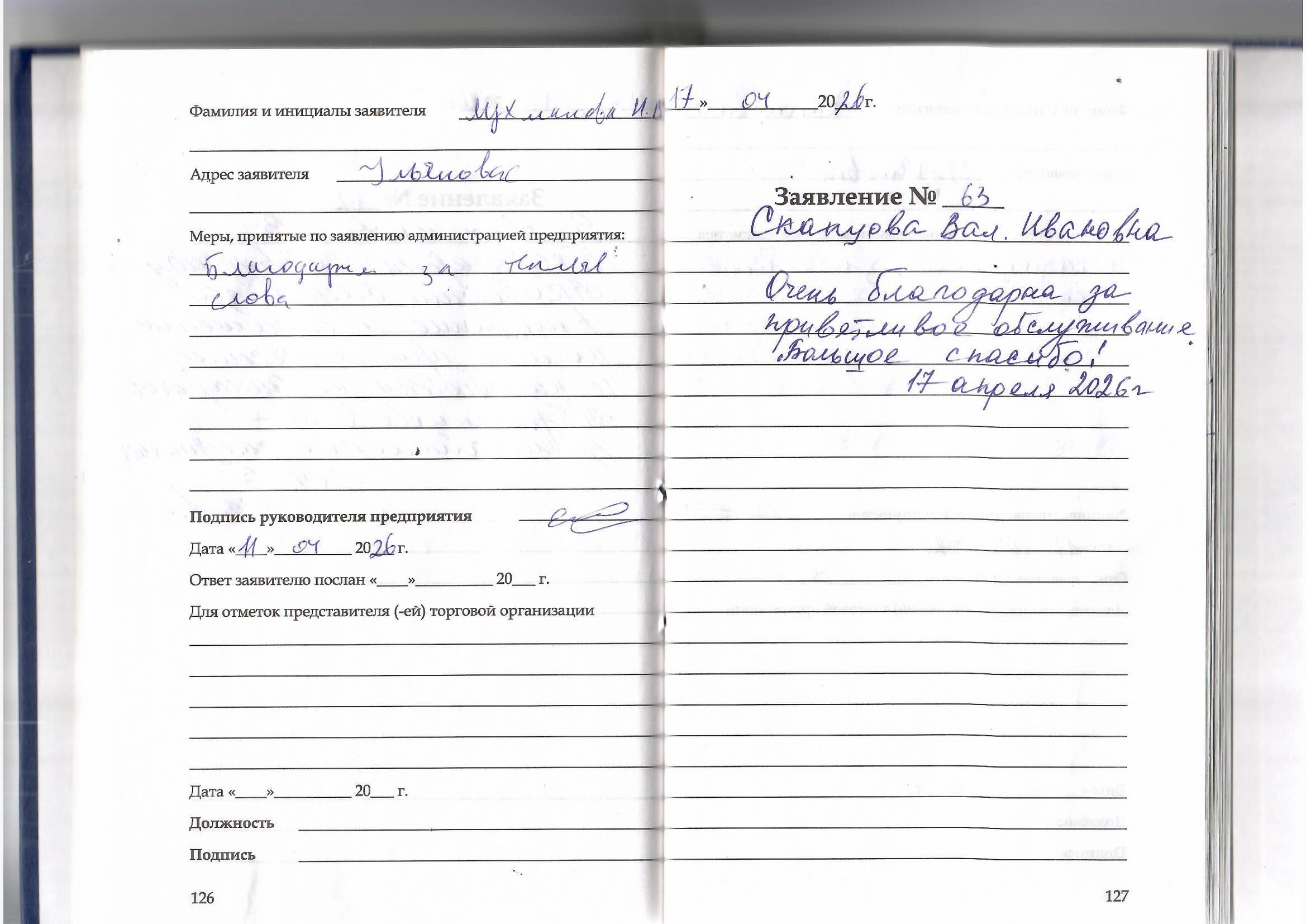 Очень благодарна за приветливое обслуживание. Большое спасибо.