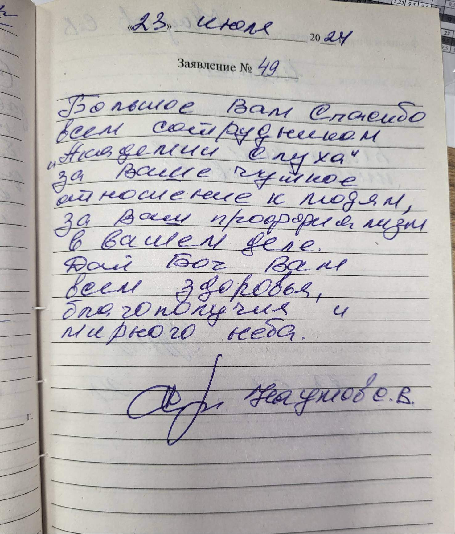 Большое Вам Спасибо всем сотрудникам "Академии слуха" за Ваше чуткое отношение к людям, за Ваш профессионализм в вашем деле. Дай Бог Вам всем здоровья, благополучия и мирного неба.