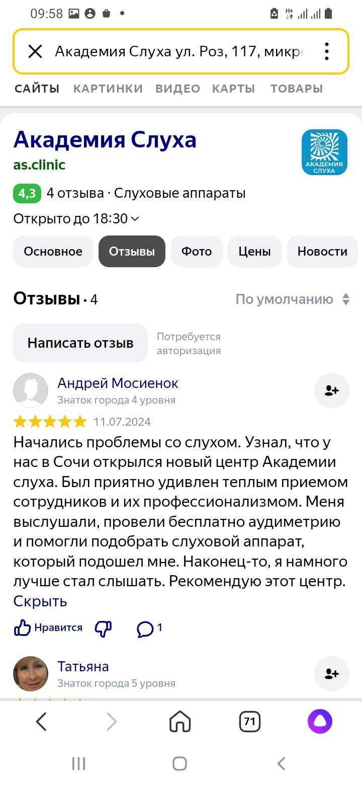 Начались проблемы со слухом. Узнал, что у нас в Сочи открылся новый центр Академии слуха. Был приятно удивлен теплым приемом сотрудников и их профессионализмом. Меня выслушали, провели бесплатно аудиометрию и помогли подобрать слуховой аппарат, который подошел мне. Наконец-то я намного лучше стал слышать. Рекомендую этот центр.