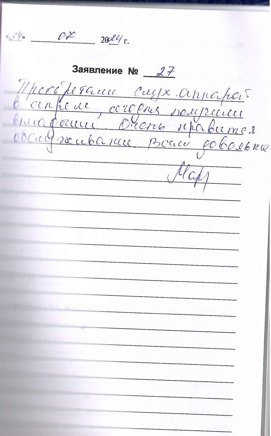 Все очень понравилось: само отношение к пожилому человеку, все подробно рассказали и показали, как пользоваться аппаратом, а самое главное рассказали о состоянии моего слуха, раньше никто не объяснял, просто говорили, что нужен слуховой аппарат.