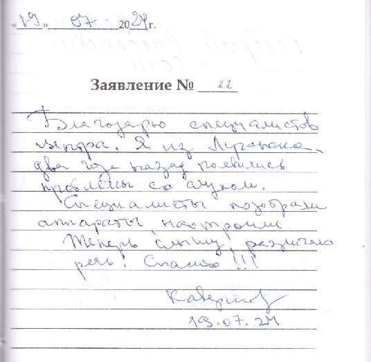 Благодарю специалистов центра. Я из Луганска, два года назад появились проблемы со слухом. Специалисты подобрали аппараты, настроили. Теперь слышу, различаю речь! Спасибо!!!