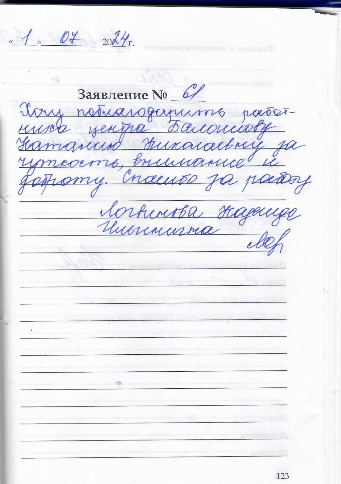 Хочу поблагодарить работника центра Балашову Наталию Николаевну за чуткость ,внимание и доброту . Спасибо за работу.