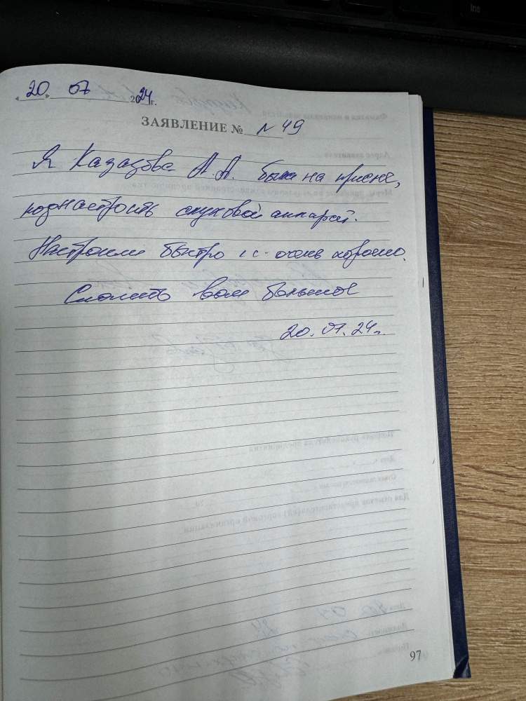 Я Казазова А.А. была на приеме, поднастроить слуховой аппарат. Настроили быстро и очень хорошо. Спасибо вам большое 20.07.24г.