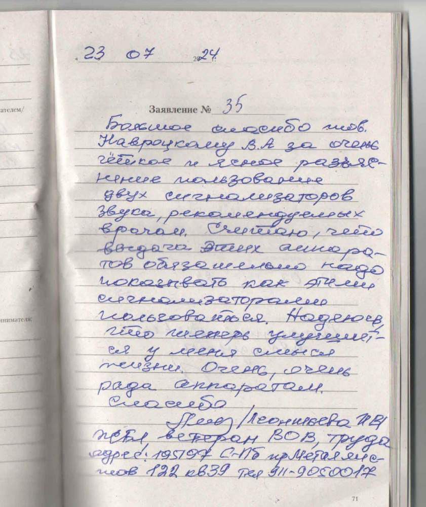 Большое спасибо , тов. Навроцкому В.А. за очень четкое и ясное разъяснения пользования двух сигнализаторов звука , рекомендованных врачом . Считаю что выдача этих сигнализаторов , обязательно надо показывать. как этими сигнализаторами пользоваться. Надеюсь что теперь улучшится у меня смысл жизни. Очень рада аппаратам спасибо.