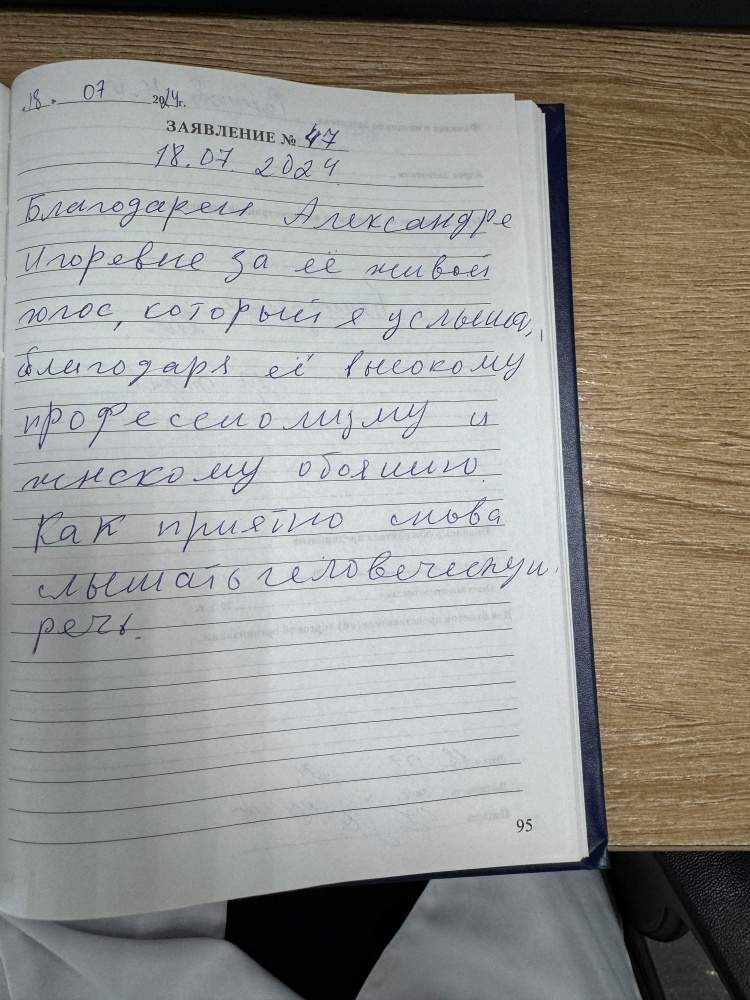 Благодарен Александре Игоревне за её живой голос, который я услышал благодаря её высокому профессионализму и женскому обаянию. Как приятно снова слышать человеческую речь.