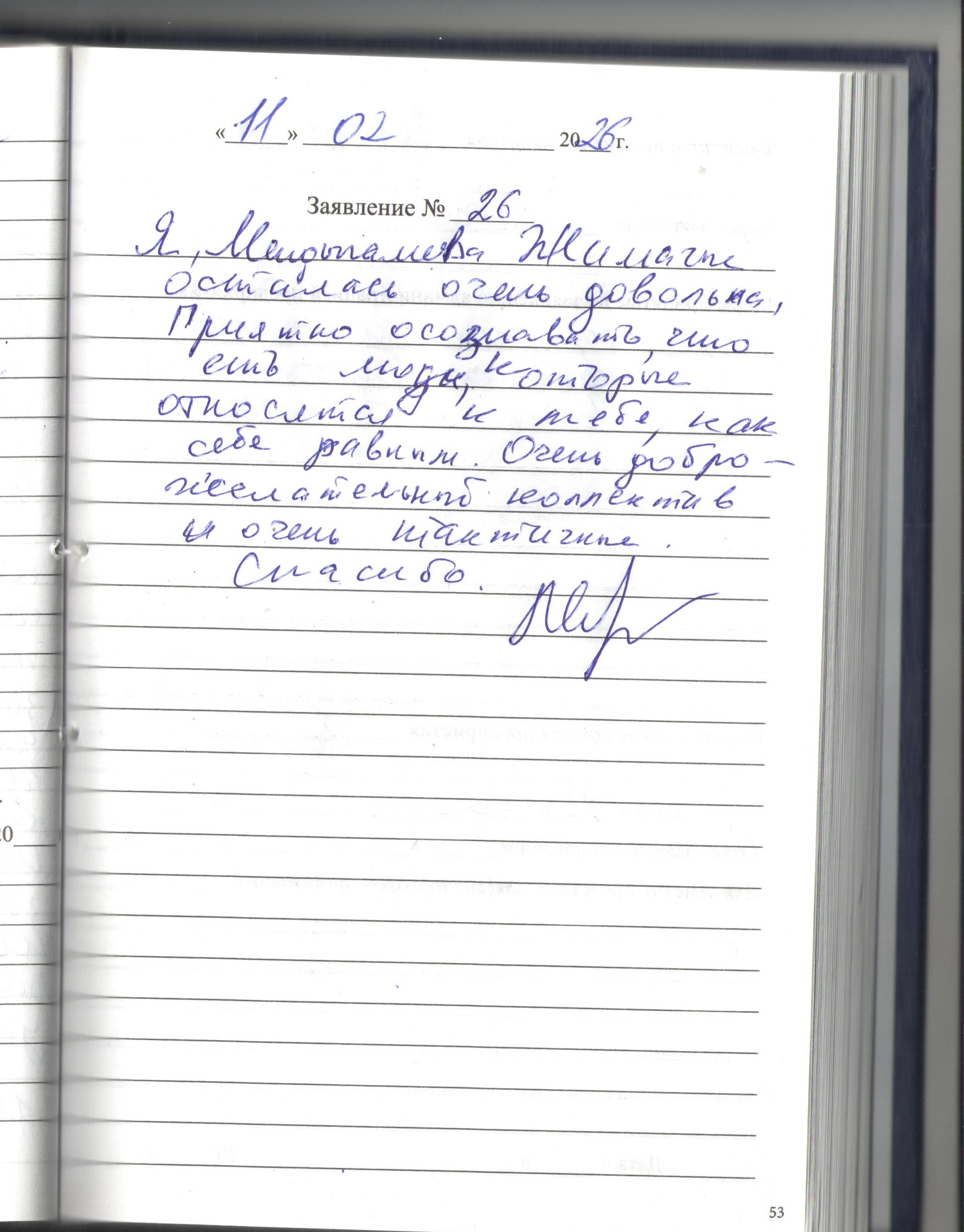 Я, Мендыгалиева Жимагыс, осталась очень довольна. Приятно осознавать, что есть люди, которые относятся к тебе, как к равным. Очень доброжелательный коллектив и очень тактичные. Спасибо.