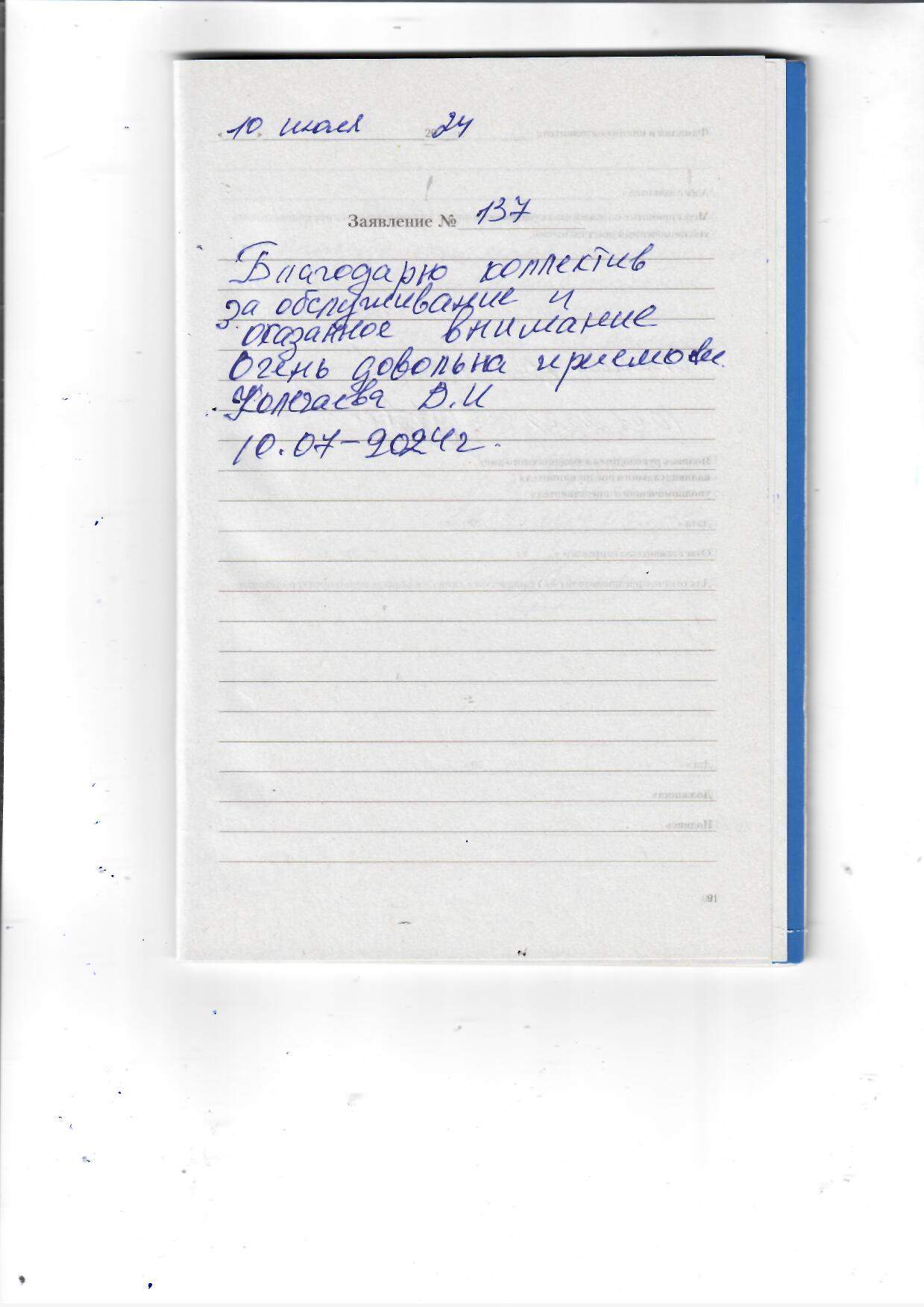 Благодарю коллектив за обслуживание и оказанное внимание очень довольна приемом. Колегаева В.И.