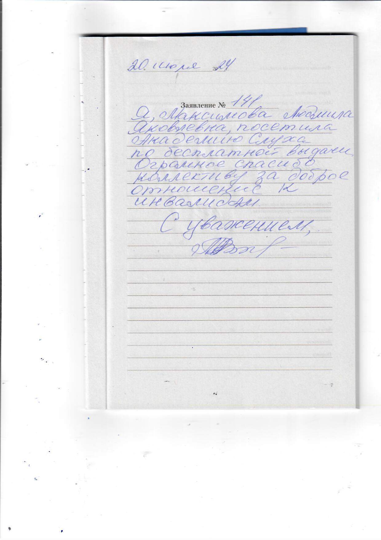 Я, Максимова Людмила Яковлевна, посетила Академию Слуха по бесплатной выдачи. Огромное спасибо коллективу за доброе отношение к инвалидам. С уважением,