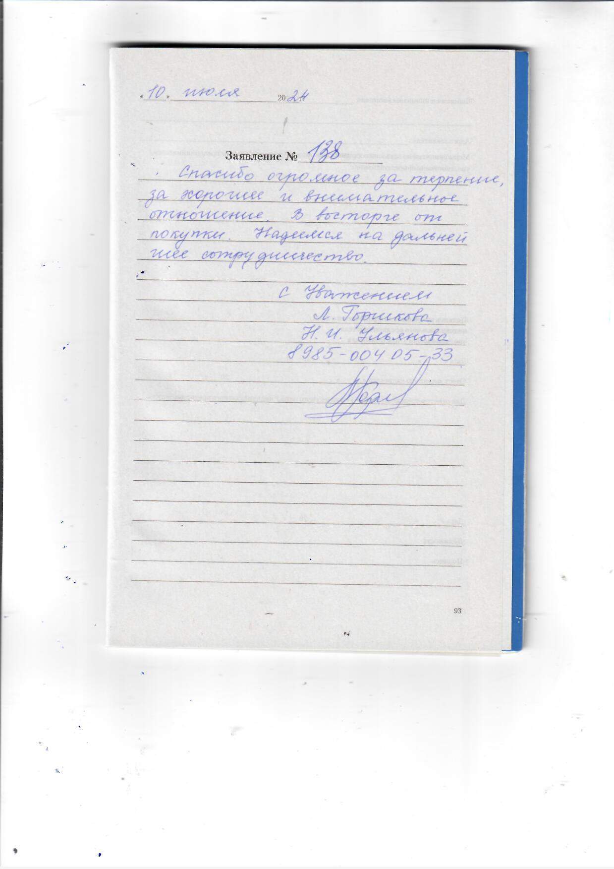 Спасибо огромное за терпение, за хорошее и внимательное отношение. В восторге от покупки. Надеемся на дальнейшее сотрудничество. С уважением, Л. Горшкова, Н.И. Ульянова