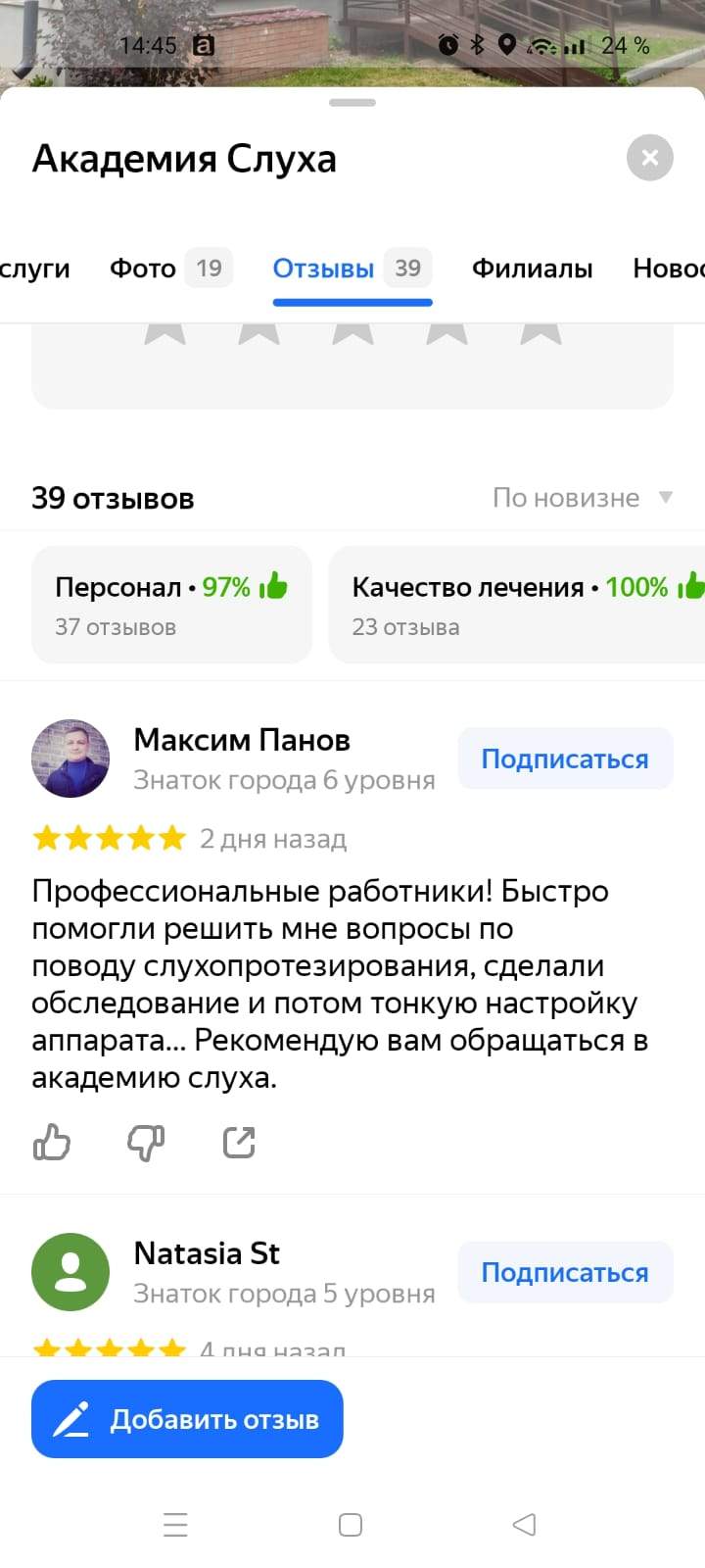 Профессиональные работники! Быстро помогли решить мне вопросы по поводу слухопротезирования, сделали обследование и потом тонкую настройку аппарата. Рекомендую вам обращаться в Академию слуха