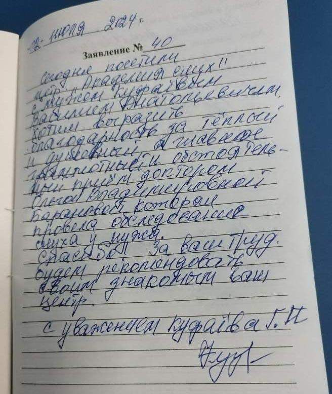 Сегодня посетили центр "Академия слуха" с мужем Куфаевым Василием Анатольевичем. Хотим выразить благодарность за теплый и душевный, а главное грамотный и обстоятельным прием доктором Ольгой Владимировной Барановой, которая провела обследование слуха у мужа. Спасибо за ваш труд. Будем рекомендовать знакомым ваш центр. С уважением, Куфаева Г.И.