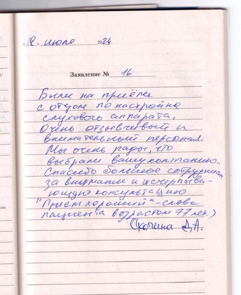 Были на приеме с отцом по настройке слухового аппарата. Очень отзывчивый и внимательный персонал. Мы рады, что выбрали вашу компанию. Спасибо большое сотрудникам за внимание и исчерпывающую консультацию. " Прием хороший"- слова пациента возрастом 77 лет.