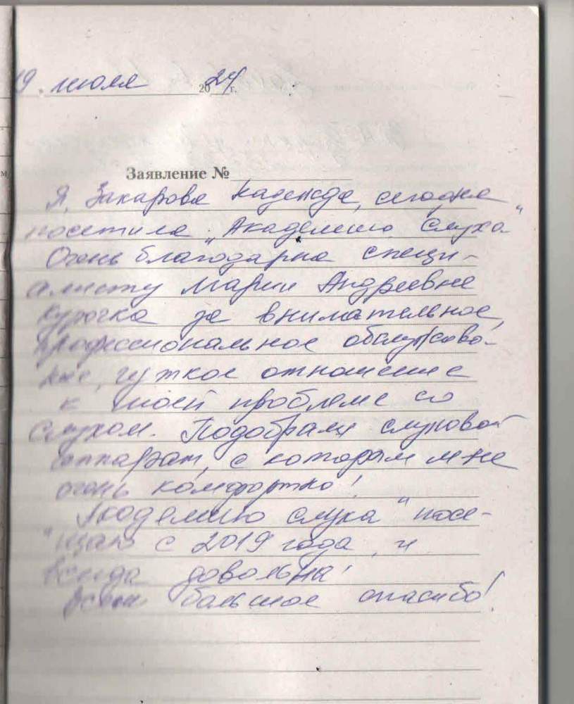 Я, Захарова Надежда, сегодня посетила "Академию слуха". Очень благодарна специалисту Марии Андреевне Курочка за внимательное, профессиональное обслуживание, чуткое отношение к моей проблеме со слухом. Подобрали слуховой аппарат, с которым мне очень комфортно! "Академию слуха" посещаю с 2019 года и всегда довольна! Все большое спасибо!