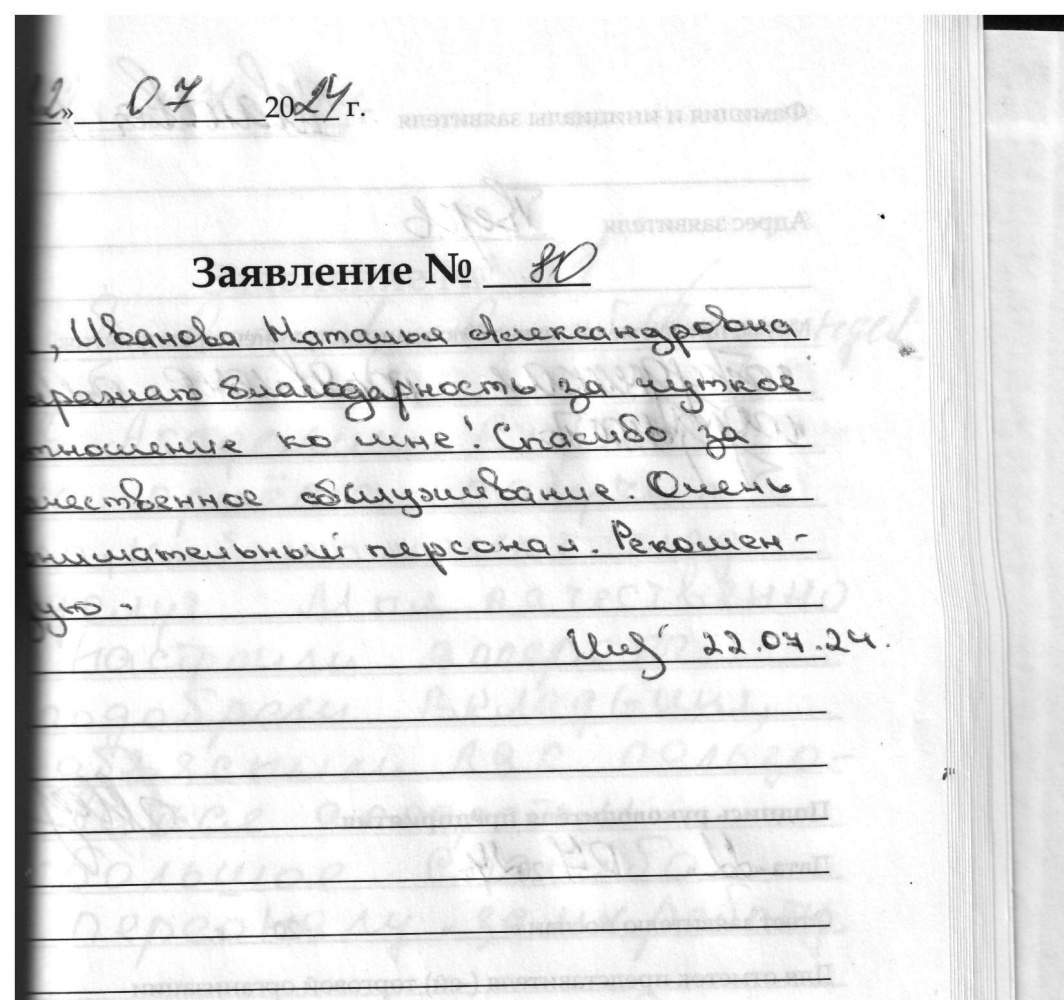 Я, Иванова Наталья Александровна выражаю благодарность за чуткое отношение ко мне! Спасибо за качественное обслуживание. Очень внимательный персонал. Рекомендую.