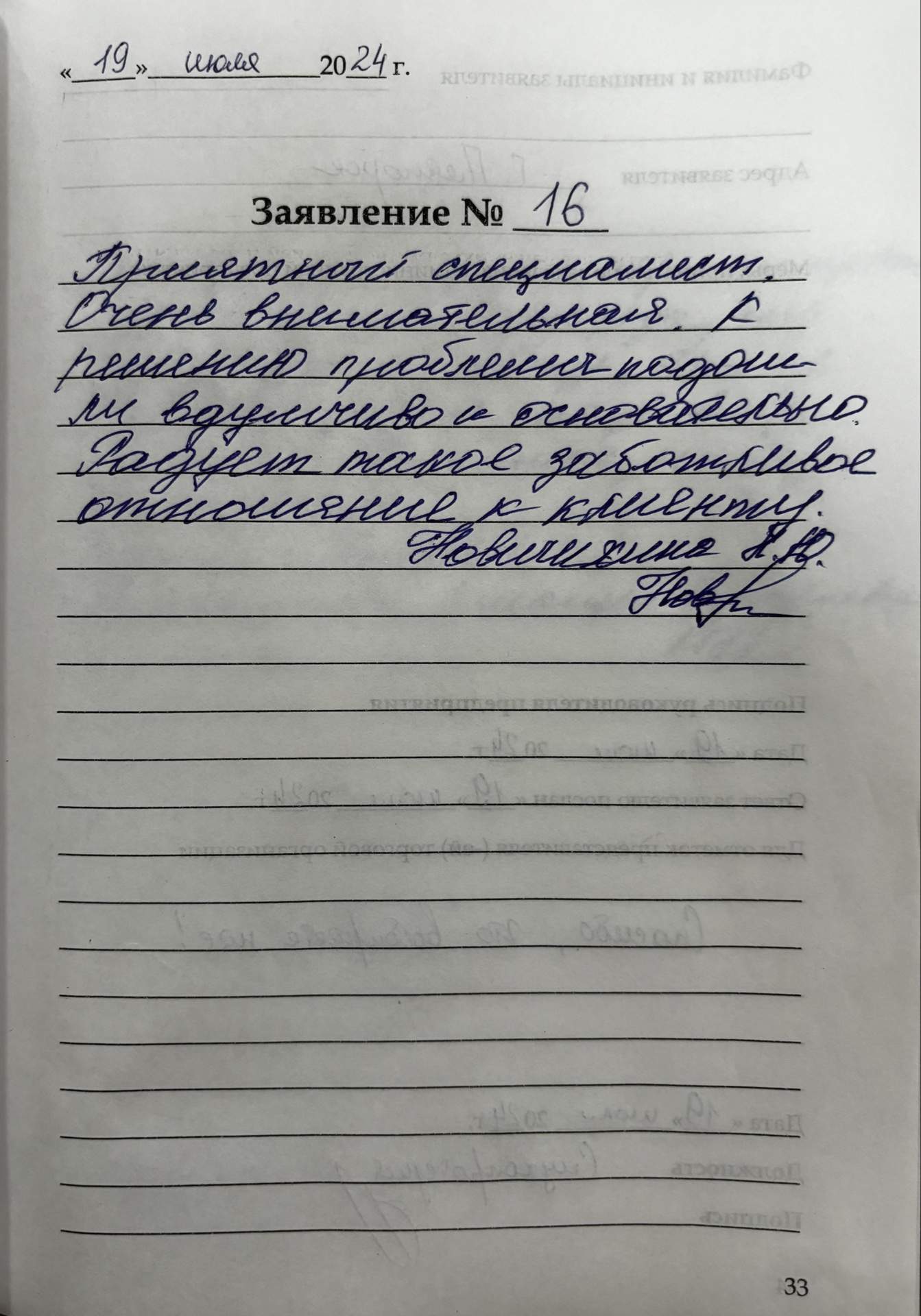 Приятный специалист. Очень внимательная. К решению проблемы подошли вдумчиво и основательно. Радует такое заботливое отношение к клиенту.