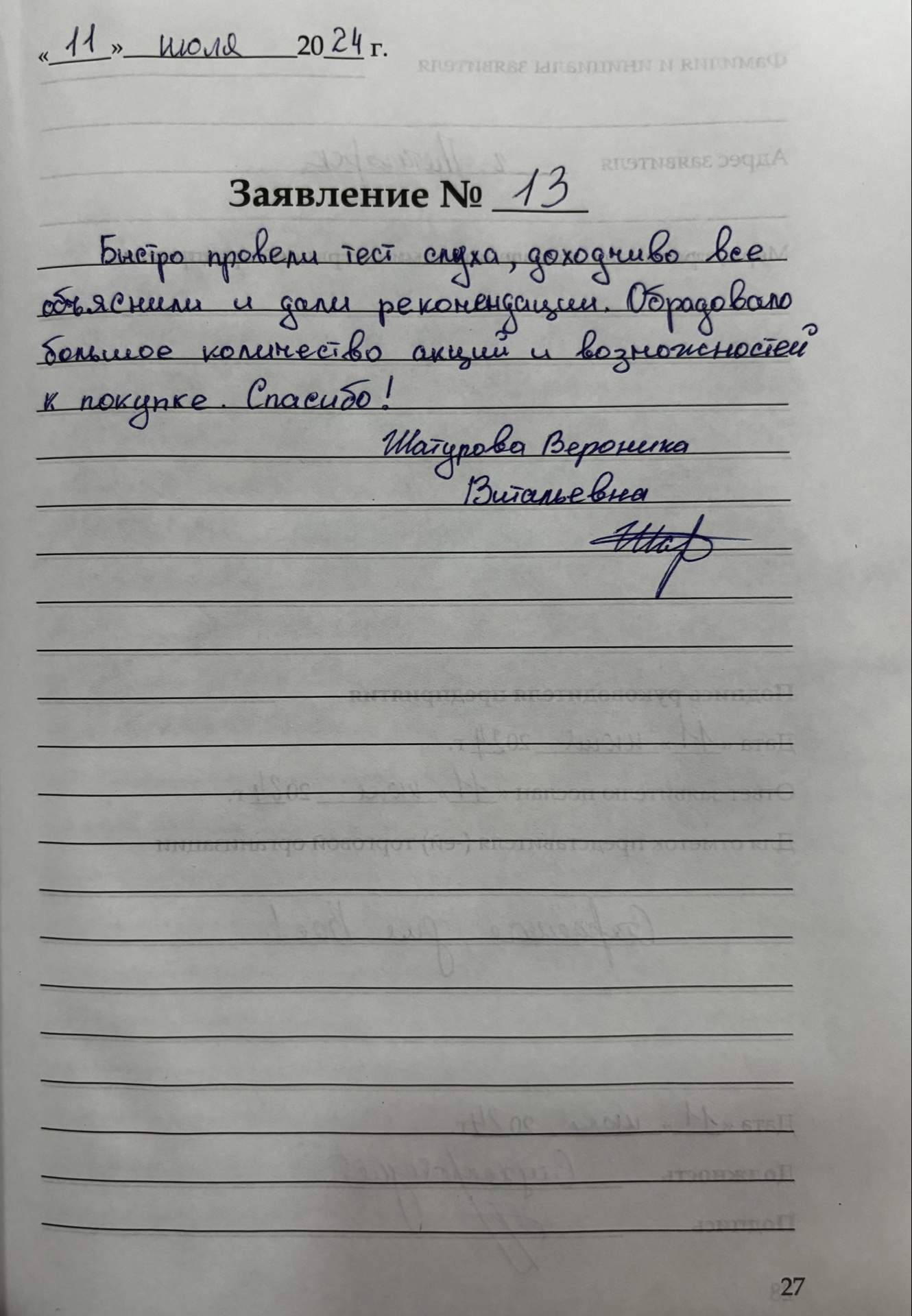 Быстро провели тест слуха, доходчиво все объяснили и дали рекомендации. Обрадовало большое количество акций и возможностей к покупке. Спасибо!