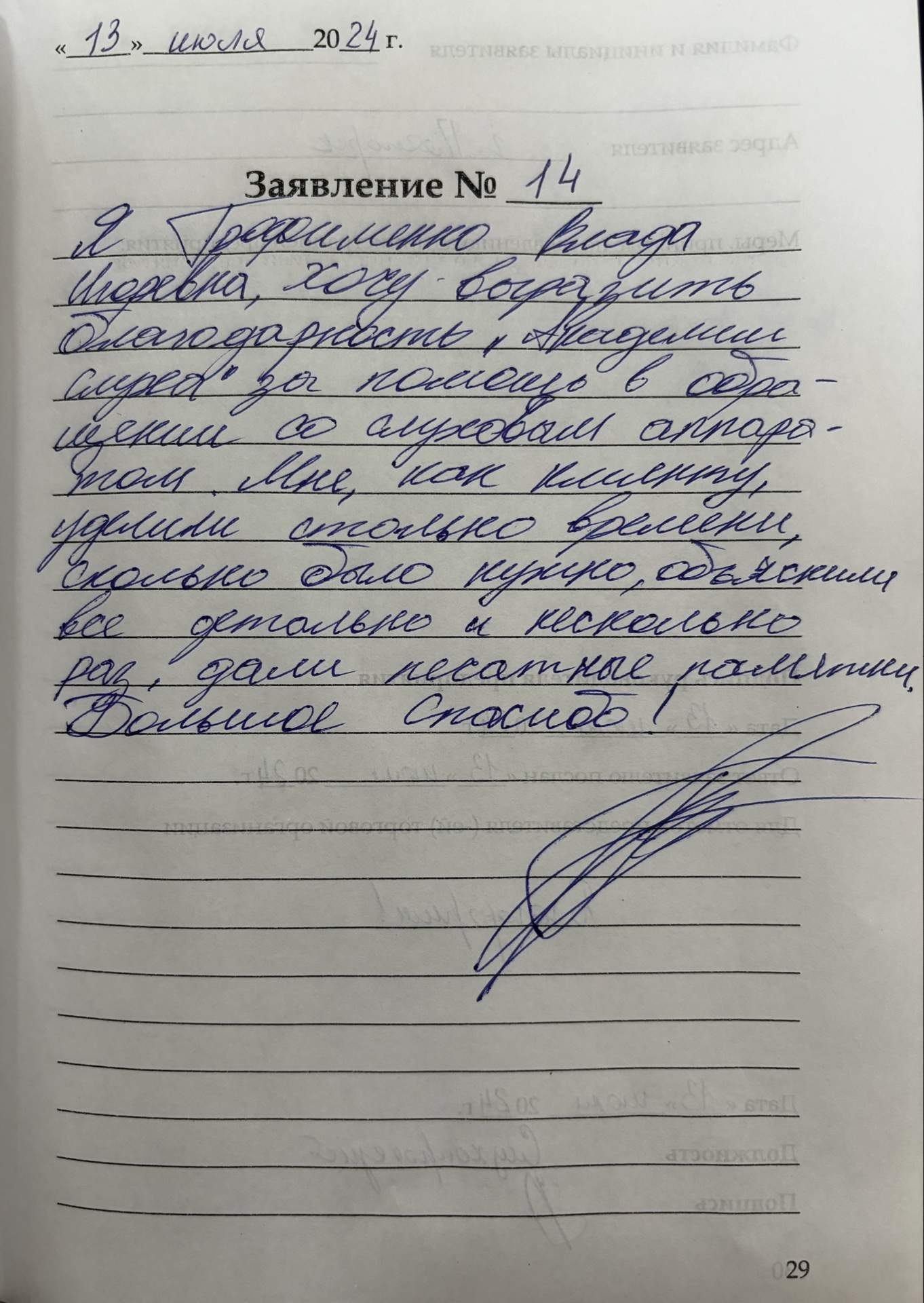 Большое спасибо врачам Академии Слуха, очень понравилось: вежливое отношение, доброта, все очень хорошо, культурно, спасибо большое!