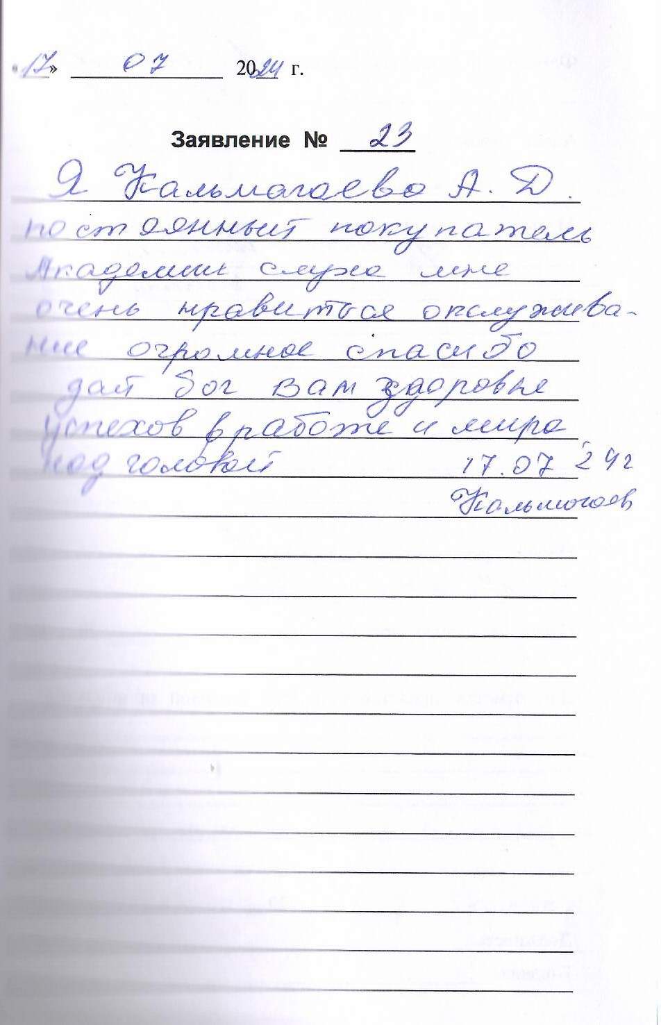 Я, Кальмагаева А.Д. постоянный покупатель "Академии слуха" , мне очень нравится обслуживание. Огромное спасибо, дай бог Вам здоровья, успехов в работе и мира над головой.