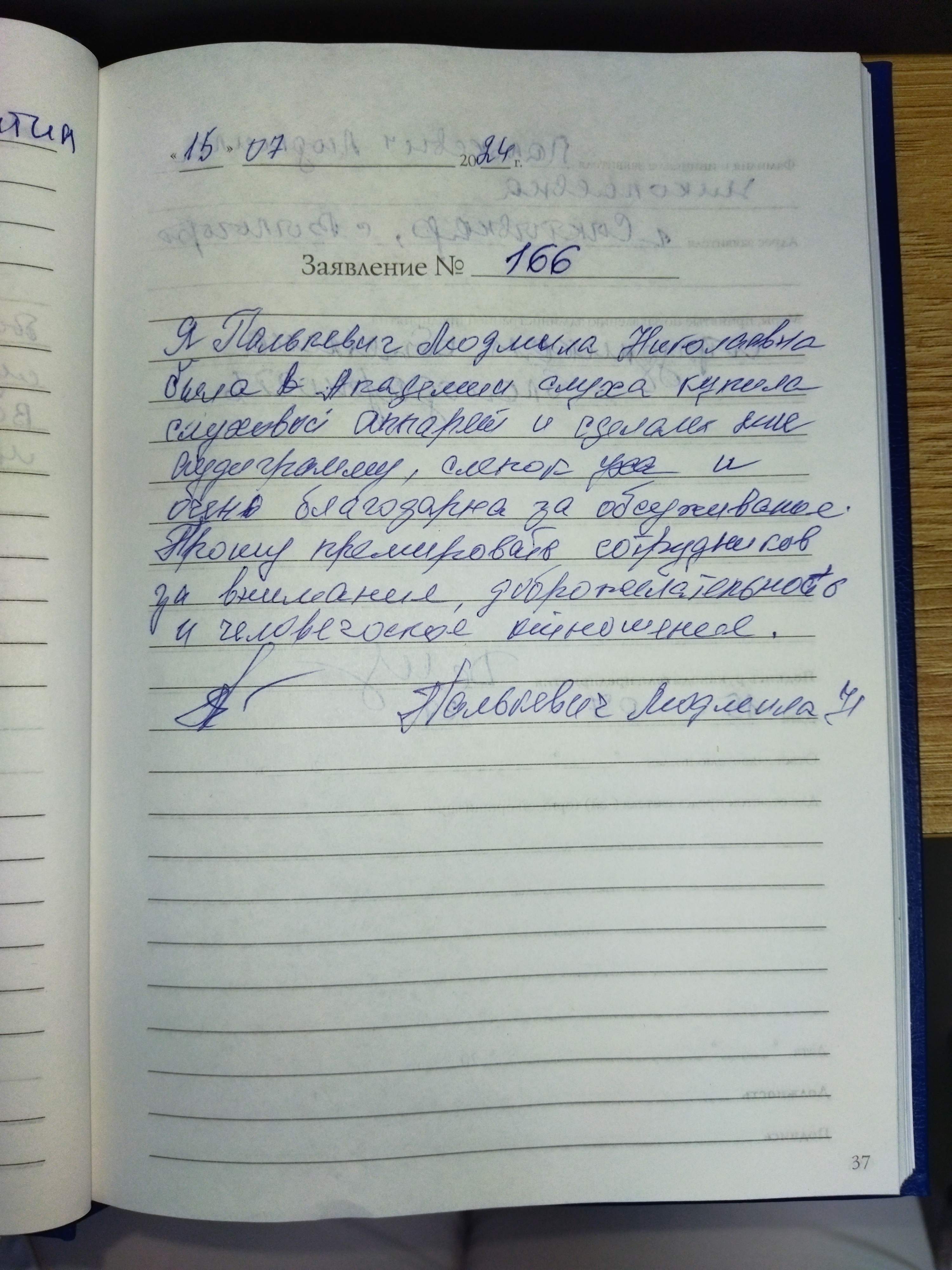 15.07.2024 Я Палькевич Людмила Николаевна была в Академии слуха купила слуховой аппарат и сделали мне аудиограмму, слепок уха и очень благодарна за обслуживание. Прошу премировать сотрудников за внимание, доброжелательность и человеческое отношение.