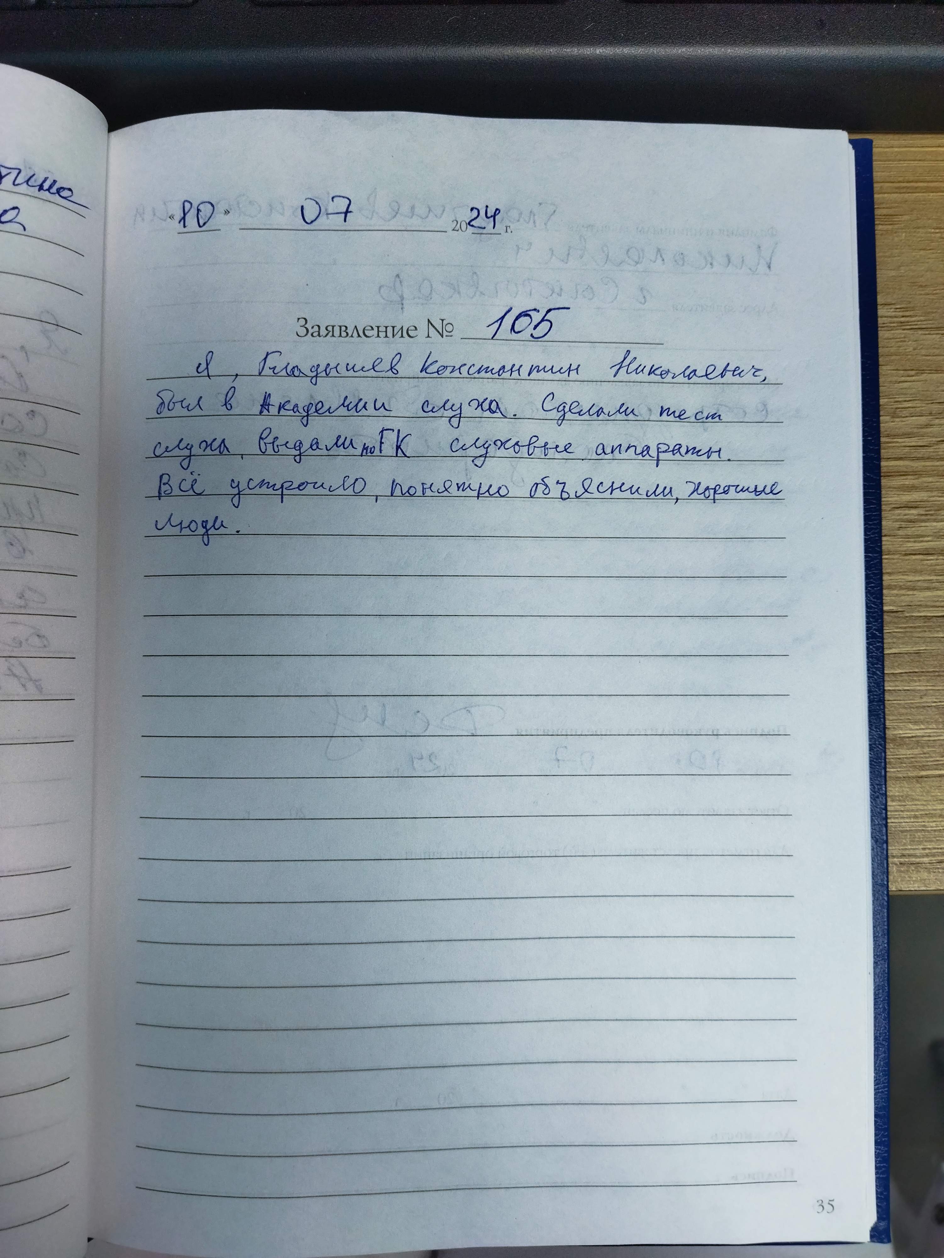 10.07.2024 Я, Гладышев Константин Николаевич, был в Академии слуха. Сделали тест слуха, выдали по ГК слуховые аппараты. Всё устроило, понятно объяснили, хорошие люди.