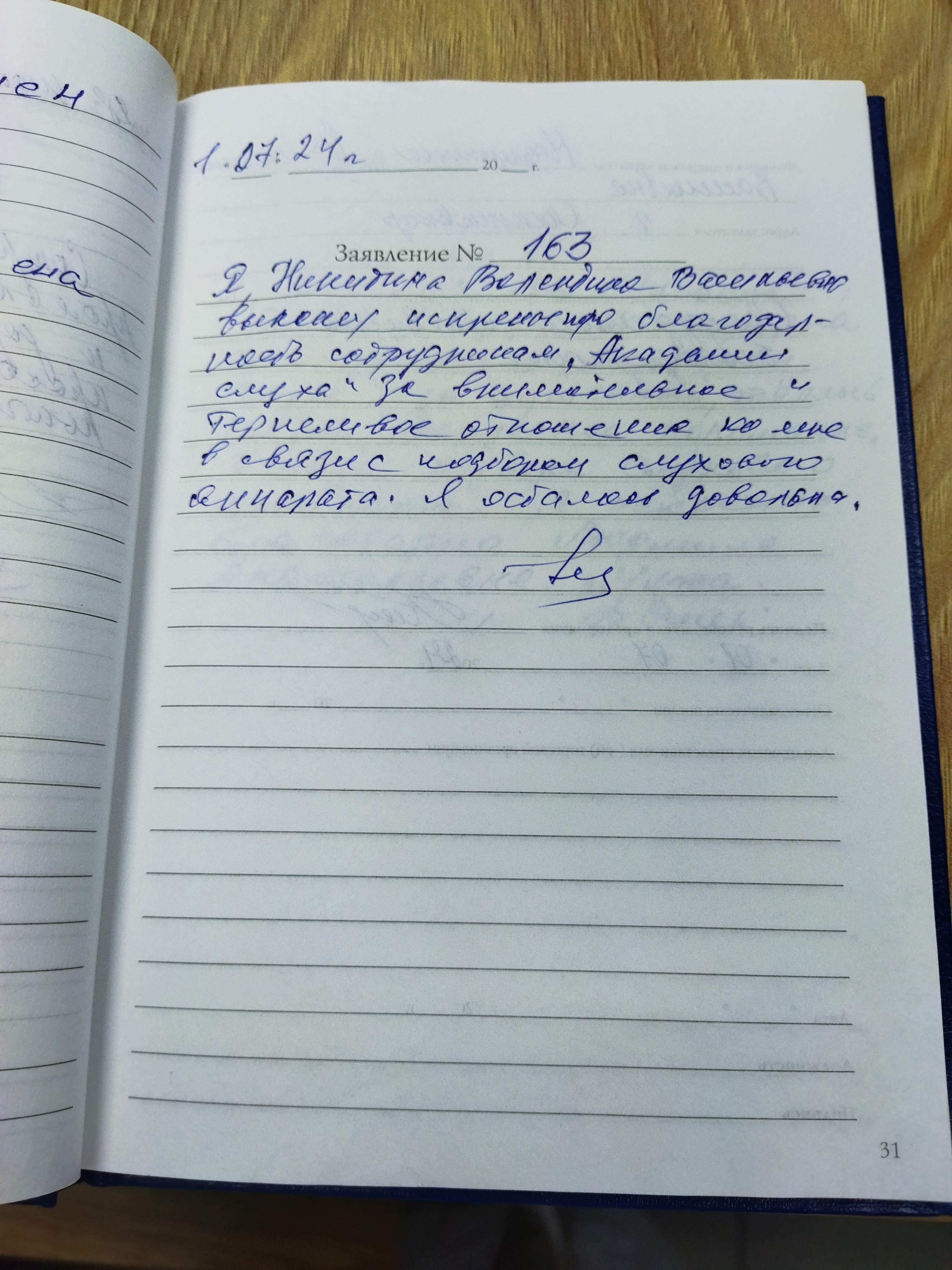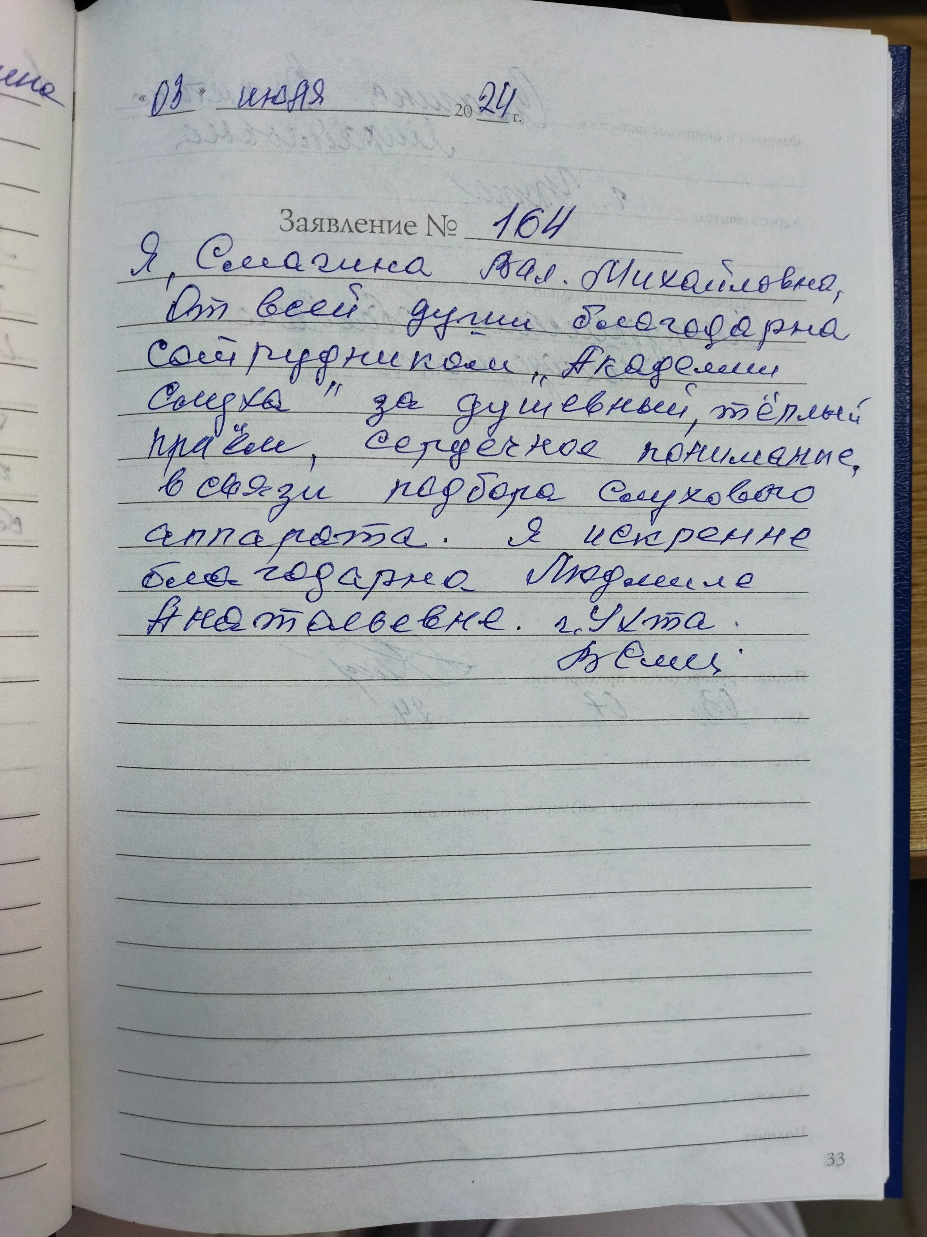 03.07.2024 Я, Смагина Вал. Михайловна, от всей души благодарна сотрудникам "Академии слуха" за душевный, тёплый приём, сердечное понимание, в связи подбора слухового аппарата. Я искренне благодарна Людмиле Анатольевне. г.Ухта.