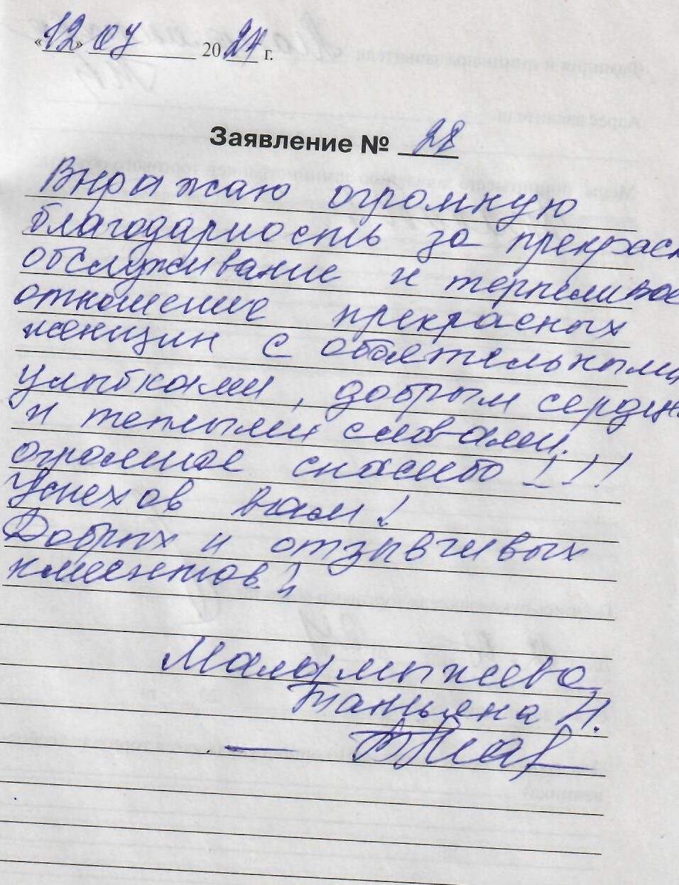 Выражаю огромную благодарность за прекрасное обслуживание прекрасных женщин с обаятельными улыбками,добрым сердцем ии теплыми словами.Огромное спасибо!!! Успехов Вам! Добрых и отзывчивых клиентов! Маламыжева Татьяна Н.