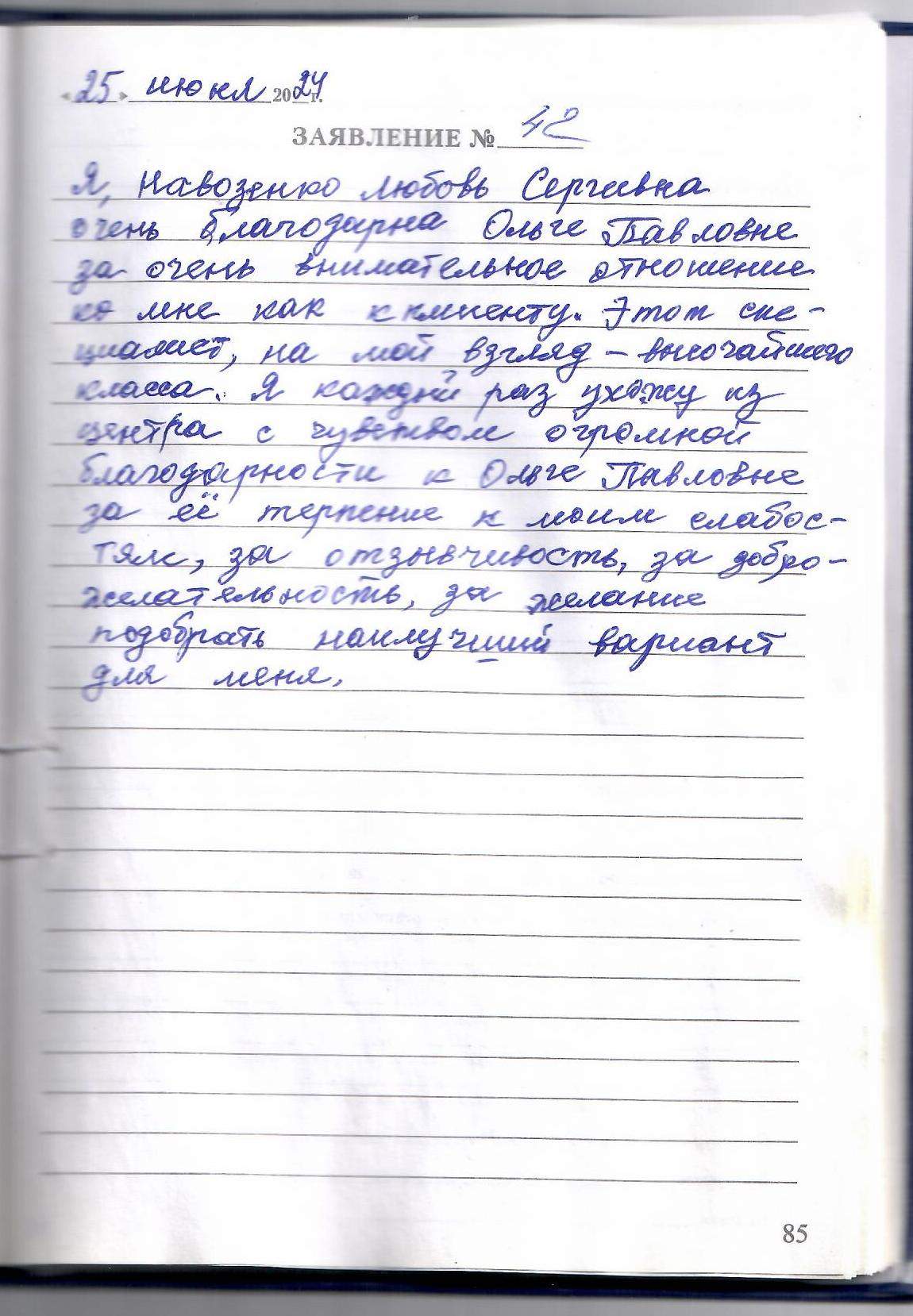 Я, Навозенко Любовь Сергеевна очень благодарна Ольге Павловне за очень внимательное отношение ко мне как к клиенту. Этот специалитет, на мой взгляд - высочайшего класса. Я каждый раз ухожу из центра с чувством огромной благодарности к Ольге Павловне за её терпение к моим слабостям, за отзывчивость, за доброжелательность, за желание подобрать наилучший вариант для меня.