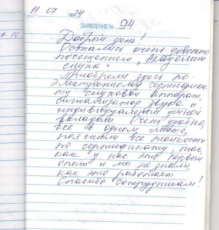 Добрый день! Остались очень довольны посещением "Академии слуха". Приобрели здесь по электронному сертификату слуховой аппарат, сигнализатор звука и индивидуальный ушной вкладыш. Очень удобно, все в одном месте , пояснили все тонкости по сертификату, так как у нас это первый опыт и мы не знали, как это работает. Спасибо сотрудникам!
