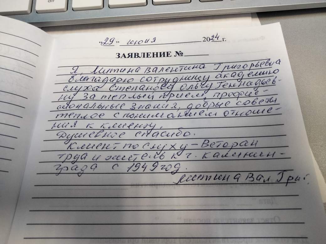 Я, Митина Валентина Григорьевна, благодарю сотрудницу Академии Слуха Степанова Ольгу Геннадьевну за теплый прием, профессиональные знания, добрые советы, теплое с пониманием отношение к клиенту. Душевное спасибо. Клиент по слуху - Ветеран труда и житель г. Калининграда с 1949 года.