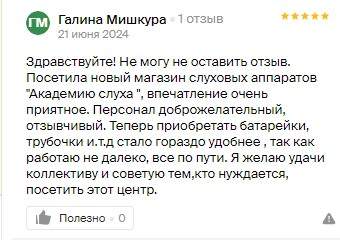 Здравствуйте! Не могу не оставить отзыв. Посетила новый магазин слуховых аппаратов "Академию слуха ", впечатление очень приятное. Персонал доброжелательный, отзывчивый. Теперь приобретать батарейки, трубочки и.т.д стало гораздо удобнее , так как работаю не далеко, все по пути. Я желаю удачи коллективу и советую тем,кто нуждается, посетить этот центр.