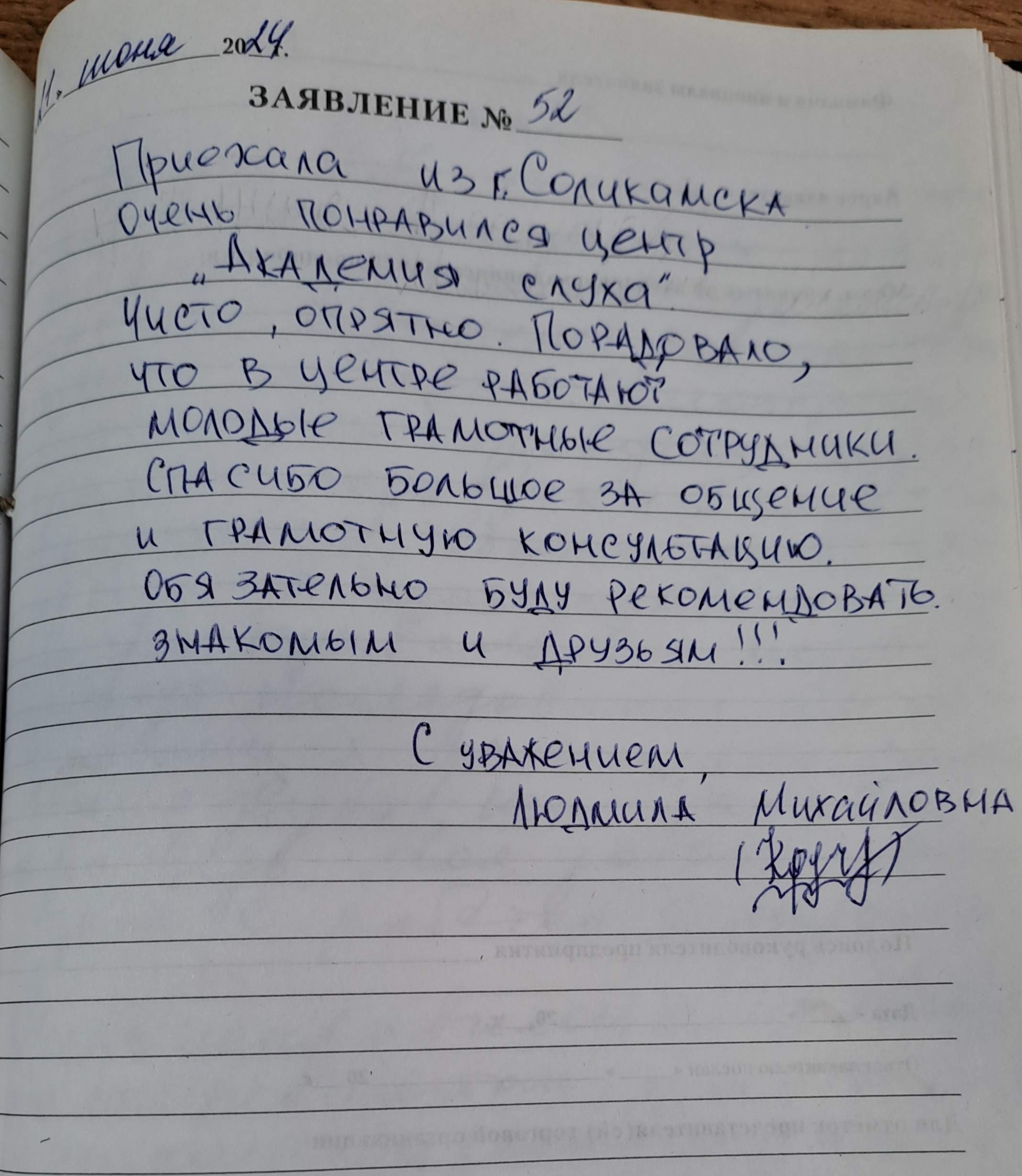 Приехала из Соликамска. Очень понравился центр "Академия слуха". Чисто, опрятно. Порадовало, что в центре работают молодые сотрудники. Спасибо большое за общение и грамотную консультацию. Обязательно буду рекомендовать знакомым и друзьям.