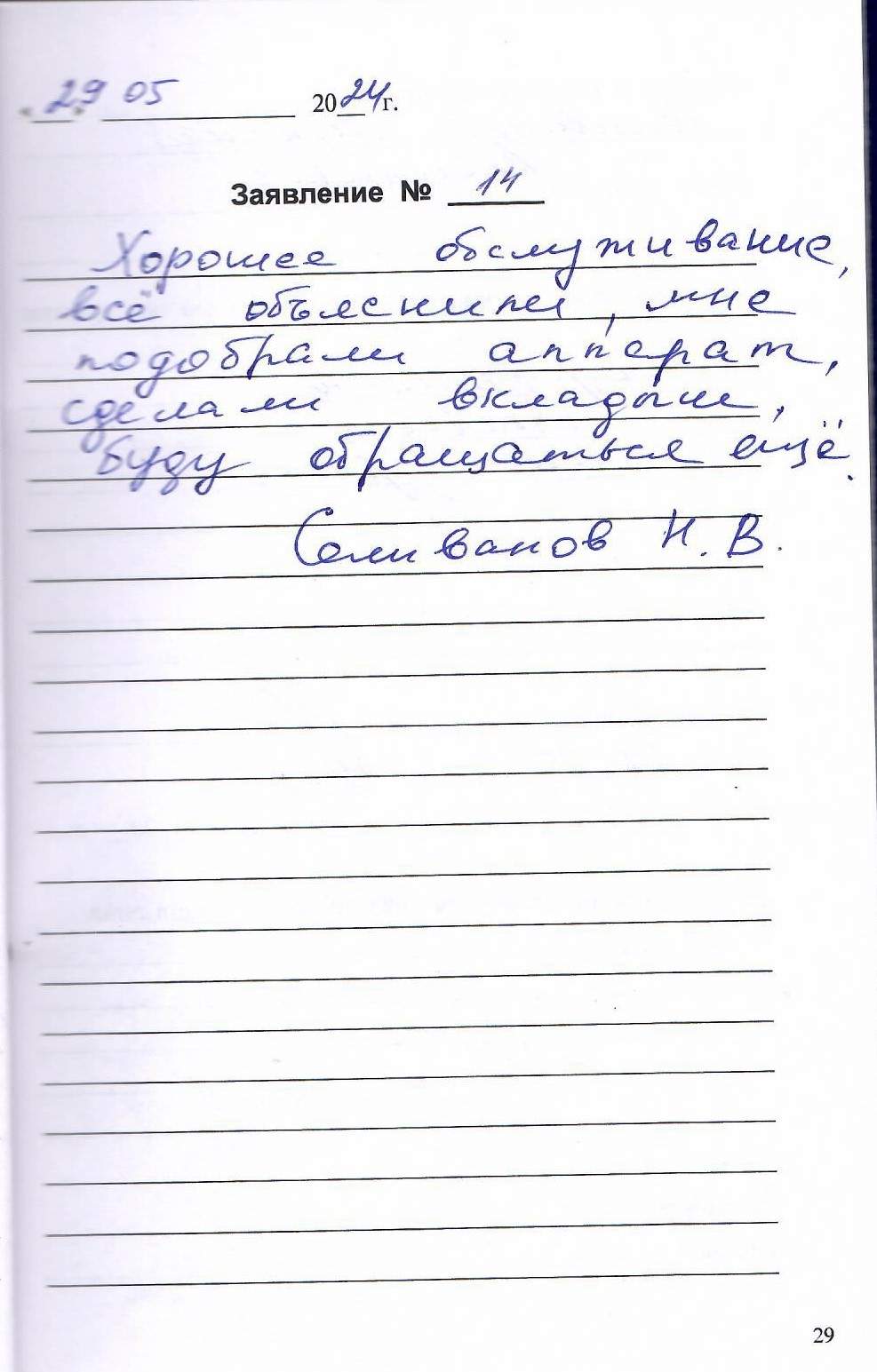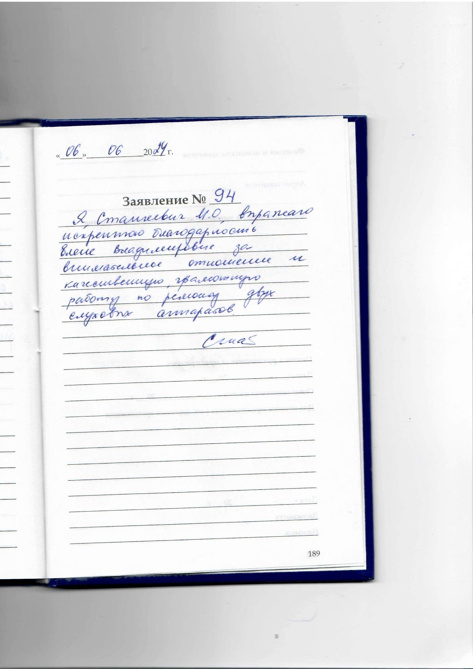 Я, Станкевич И.О., выражаю искреннюю благодарность Елене Владимировне за внимательное отношение и качественную, грамотную работу по ремонту двух слуховых аппаратов.