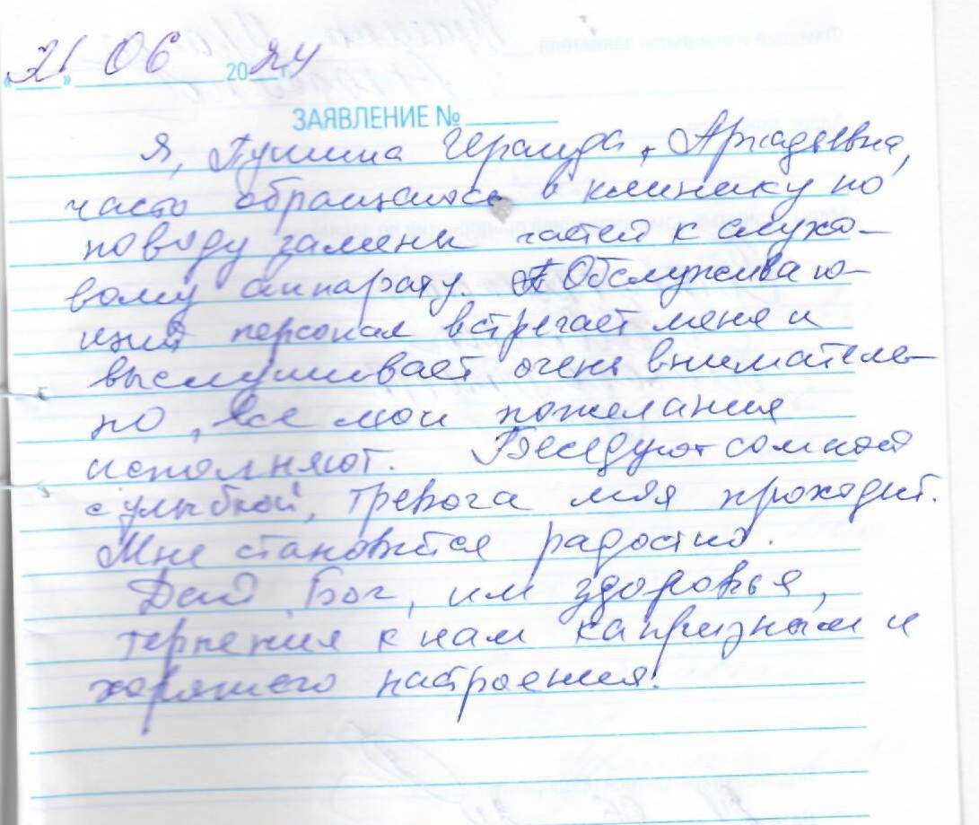Я, Пушина Ираида Аркадьевна, часто обращаюсь в центр по поводу замены частей к слуховому аппарату. Обслуживающий персонал встречает меня и выслушивает очень внимательно, все мои пожелания исполняют. Беседуют со мной с улыбкой, тревога моя проходит. Мне становится радостно. Дай Бог им здоровья, терпения к нам капризным и хорошего настроения.