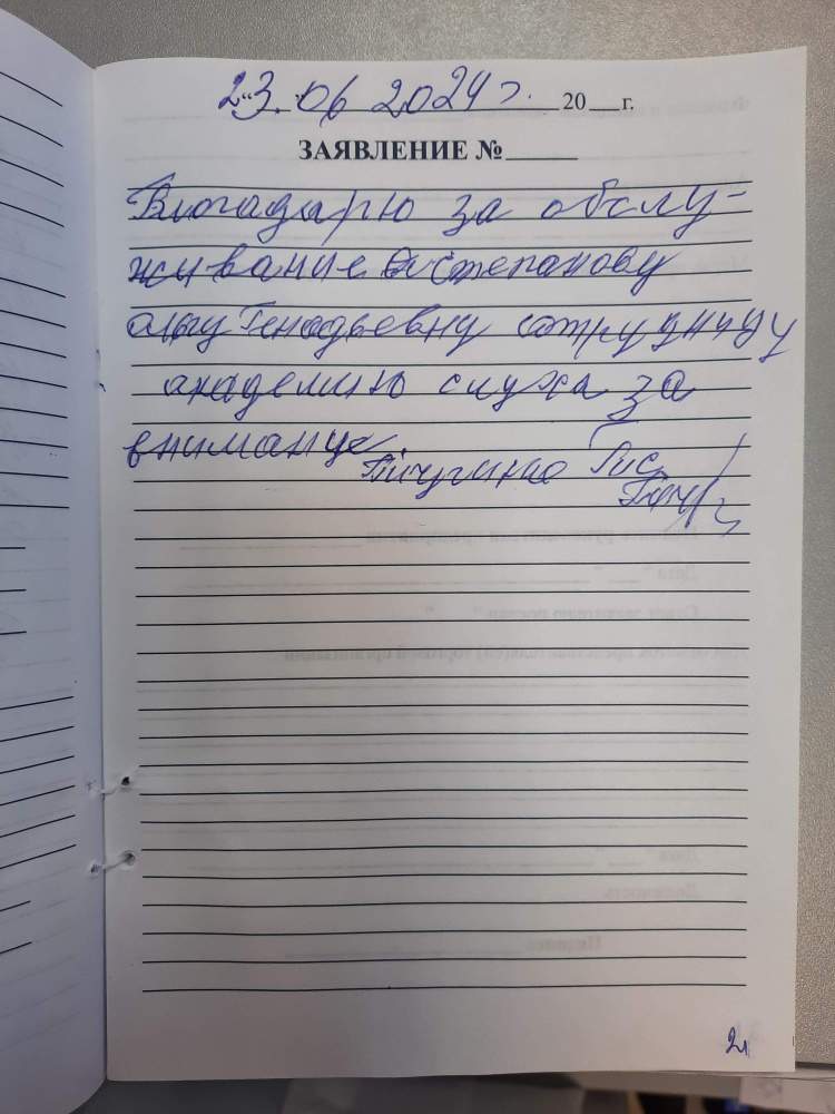 Благодарю за обслуживание Степанову Ольгу Геннадьевну, сотрудницу Академии Слуха, за внимание.