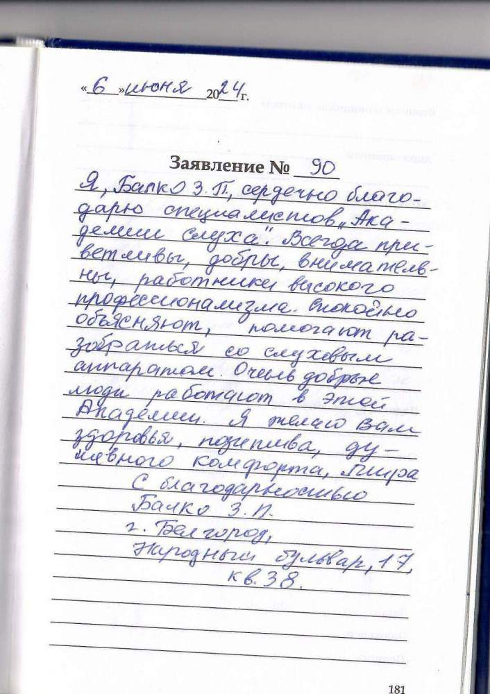 Я, Балко З.П. сердечно благодарю специалистов «Академии слуха» Всегда приветливы, добры, внимательны, работники высокого профессионализма. Спокойно объясняют, помогают разобраться со слуховым аппаратом . Очень добрые люди работают в этой академии. Я желаю вам здоровья ,позитива, душевного комфорта, мира. С благодарностью  Балко З.П.