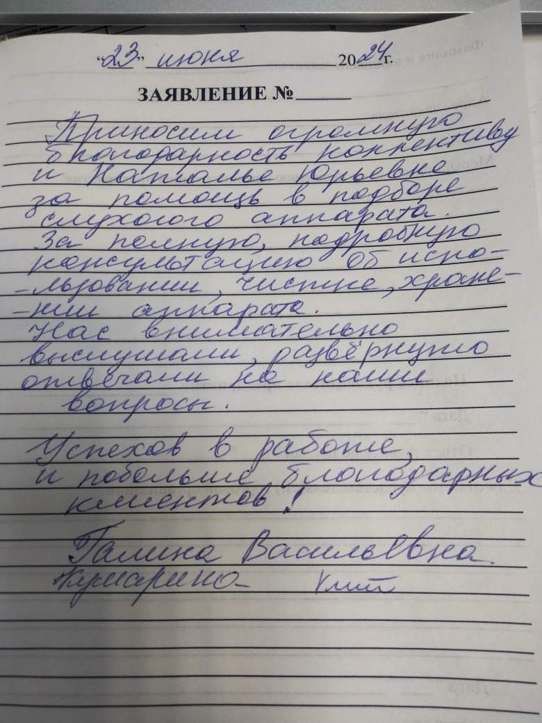 Приносим огромную благодарность коллективу и Наталье Юрьевне за помощь в подборке слухового аппарата. За полную, подробную консультацию об использовании, чистке, хранению аппарата. Нас внимательно выслушали, развернуто отвечали на все наши вопросы.