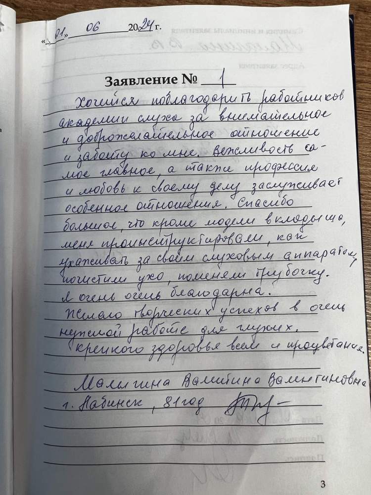 Хочется поблагодарить работников Академии слуха ! за внимательное и доброжелательное отношение и заботу ко мне . Вежливость самое главное, а также профессия и любовь к своему делу заслуживает особенное отношение. Спасибо большое , что кроме модели вкладыша , меня проконсультировали как ухаживать за слуховым аппаратом , почистили ухо, поменяли трубочку, Я очень благодарна . Желаю творческих успехов в очень нужной работе для глухих . Крепкого здоровья всем и процветания.