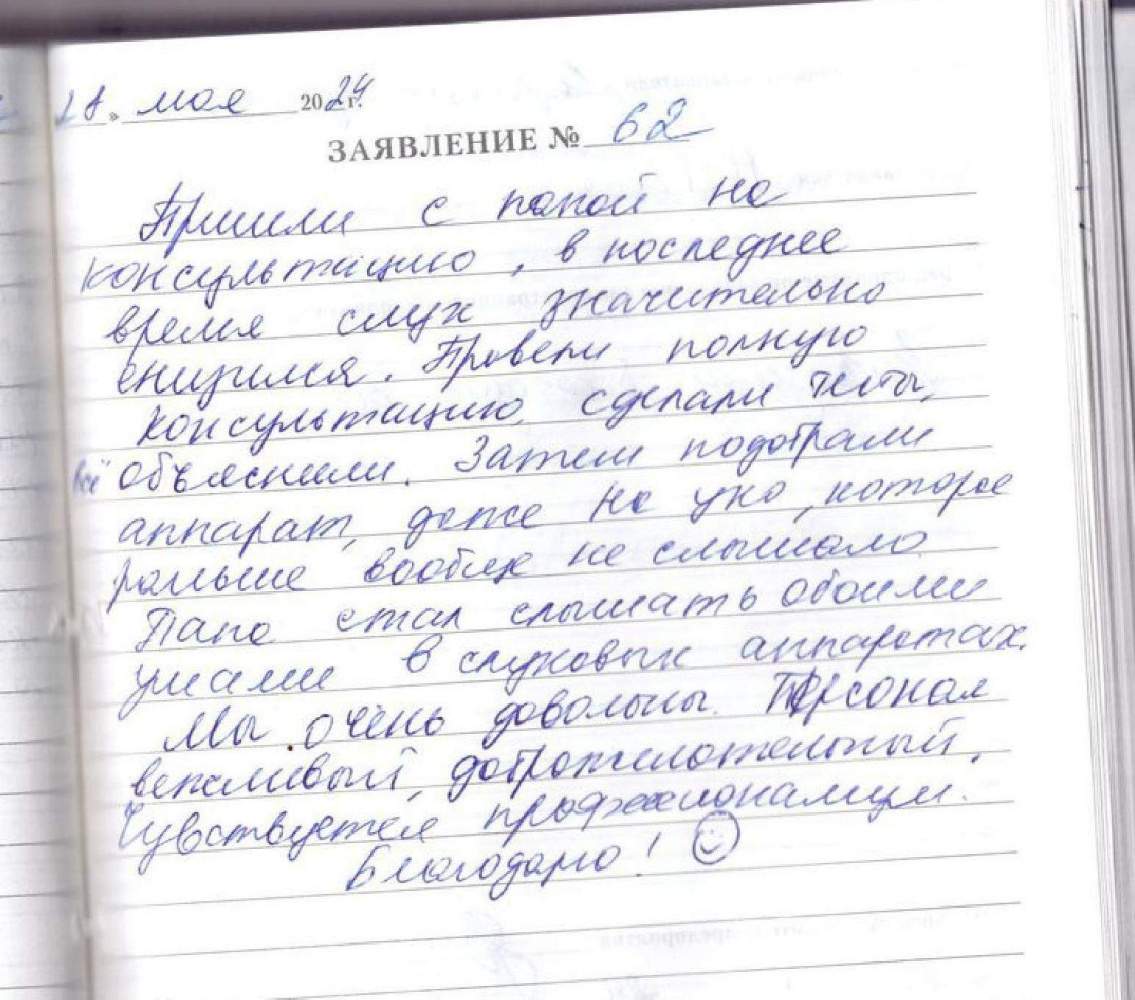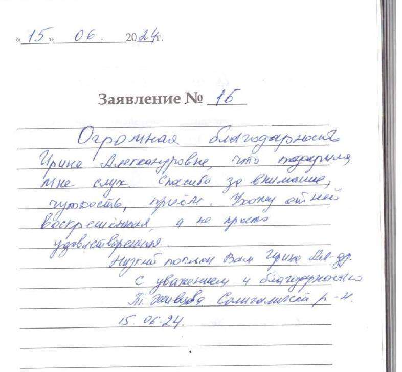 Огромная благодарность Ирине Александровне, что подарила мне слух. Спасибо за внимание, чуткость, приём. Ухожу от неё воскрешённая, а не просто удовлетворённая. Низкий поклон Вам Ирина Александровна. С уважением и благодарностью Т. Живцова Солигаличский район. 15.06.2024
