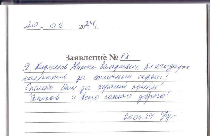 Я, Кириллов Максим Валерьевич, благодарю коллектив за отличный сервис! Спасибо Вам за хороший приём! Успехов и всего самого доброго! 20.06.2024