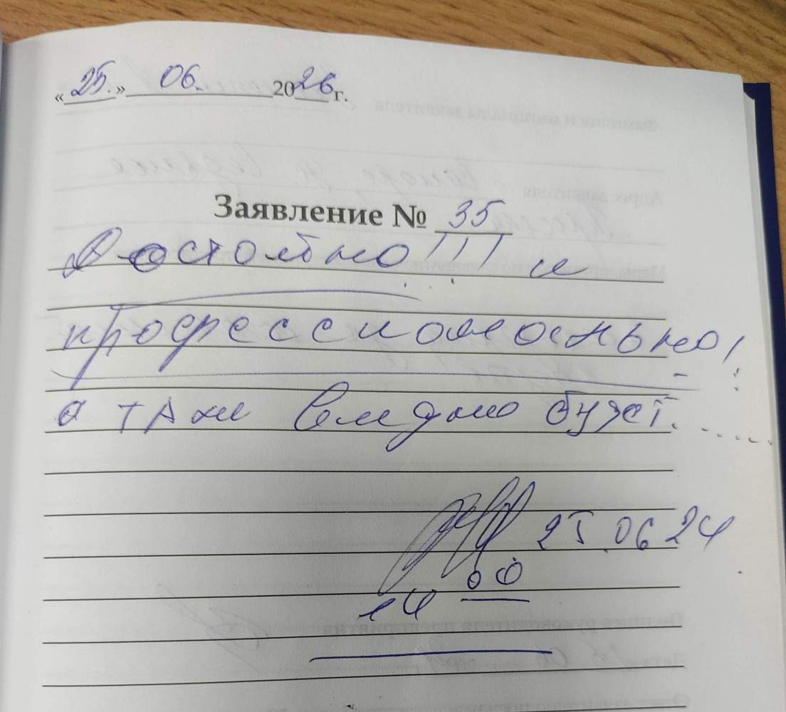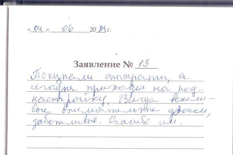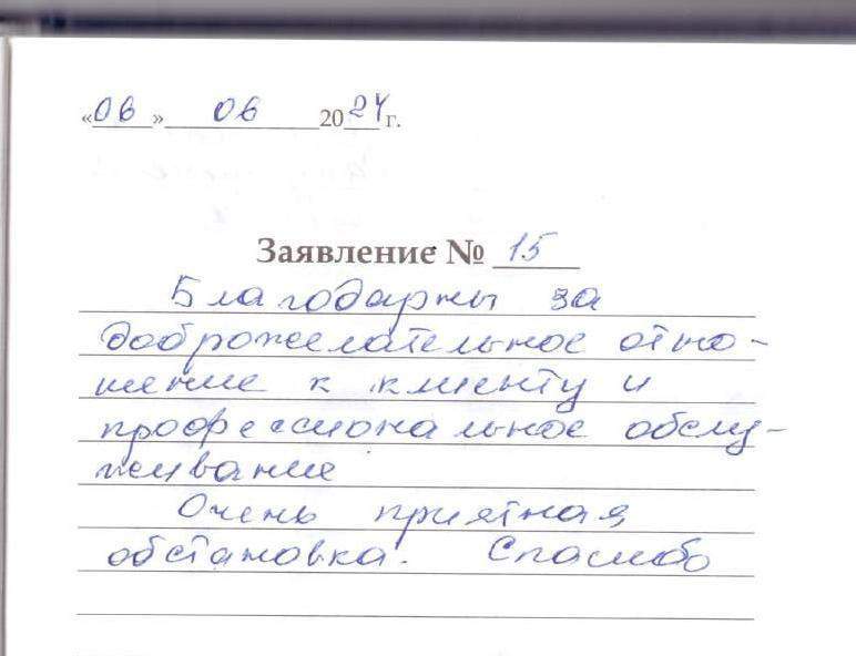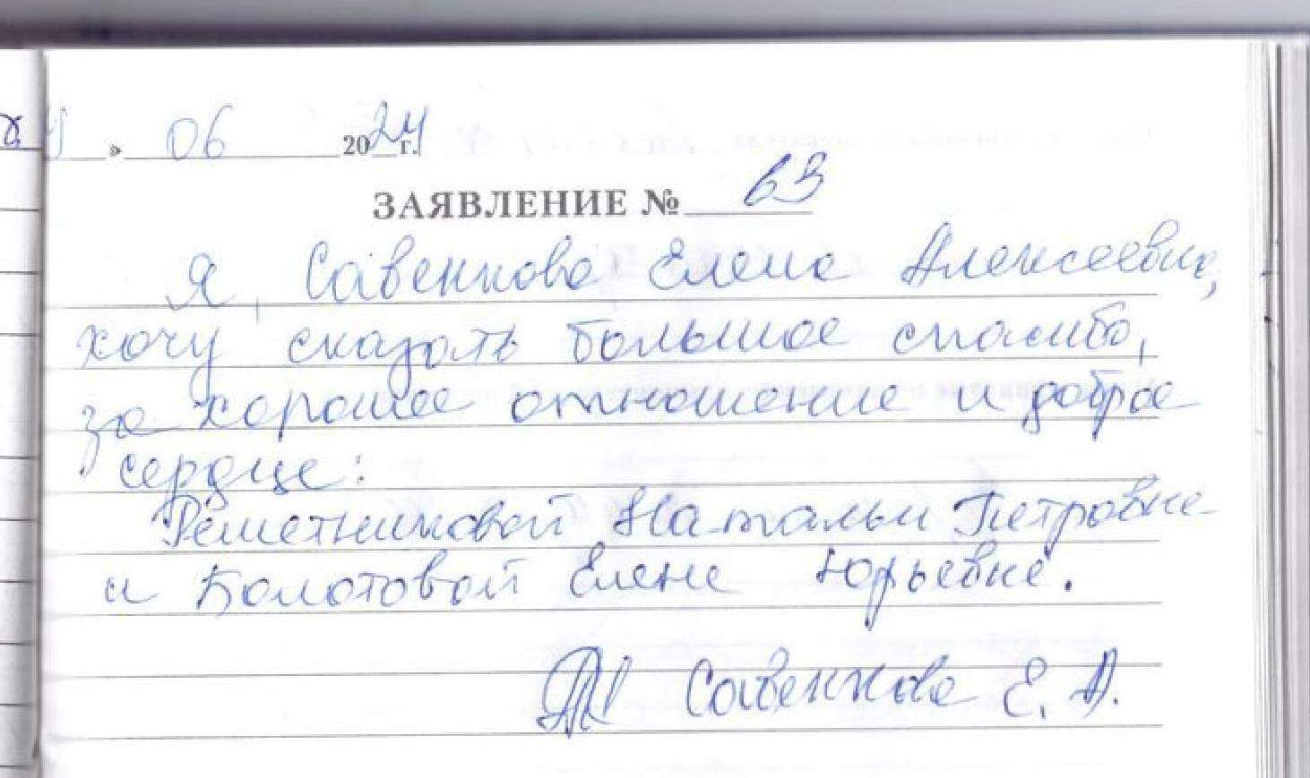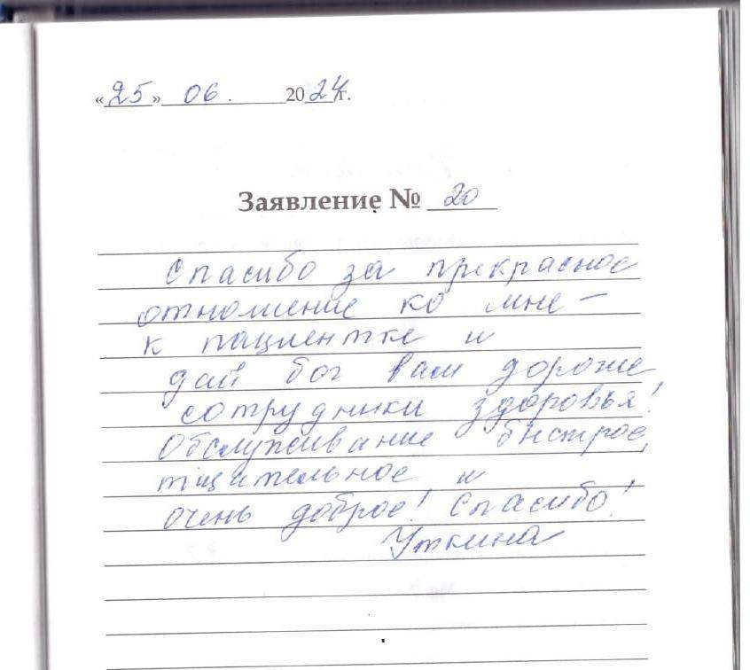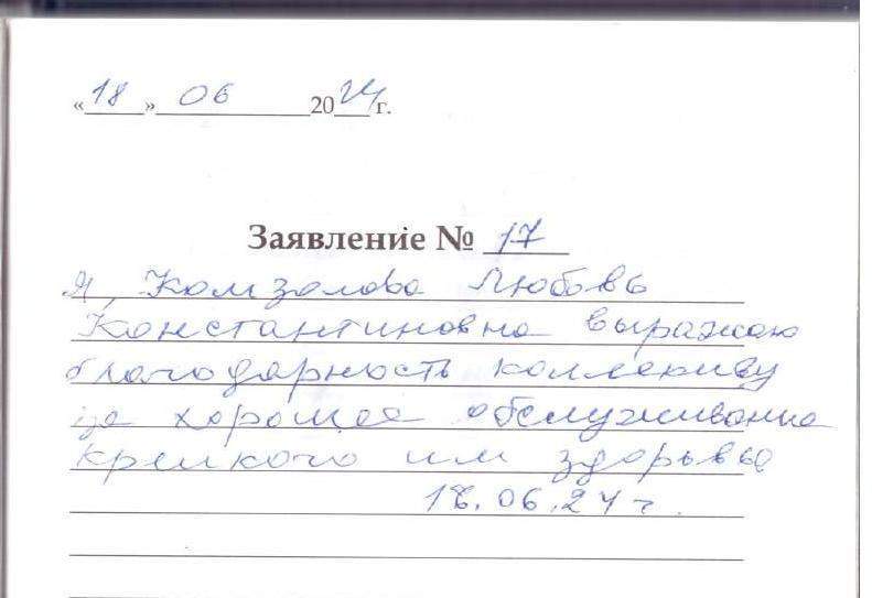 Я, Комзолова Любовь Константиновна, выражаю благодарность коллективу за хорошее обслуживание крепкого им здоровья. 16.06.2024