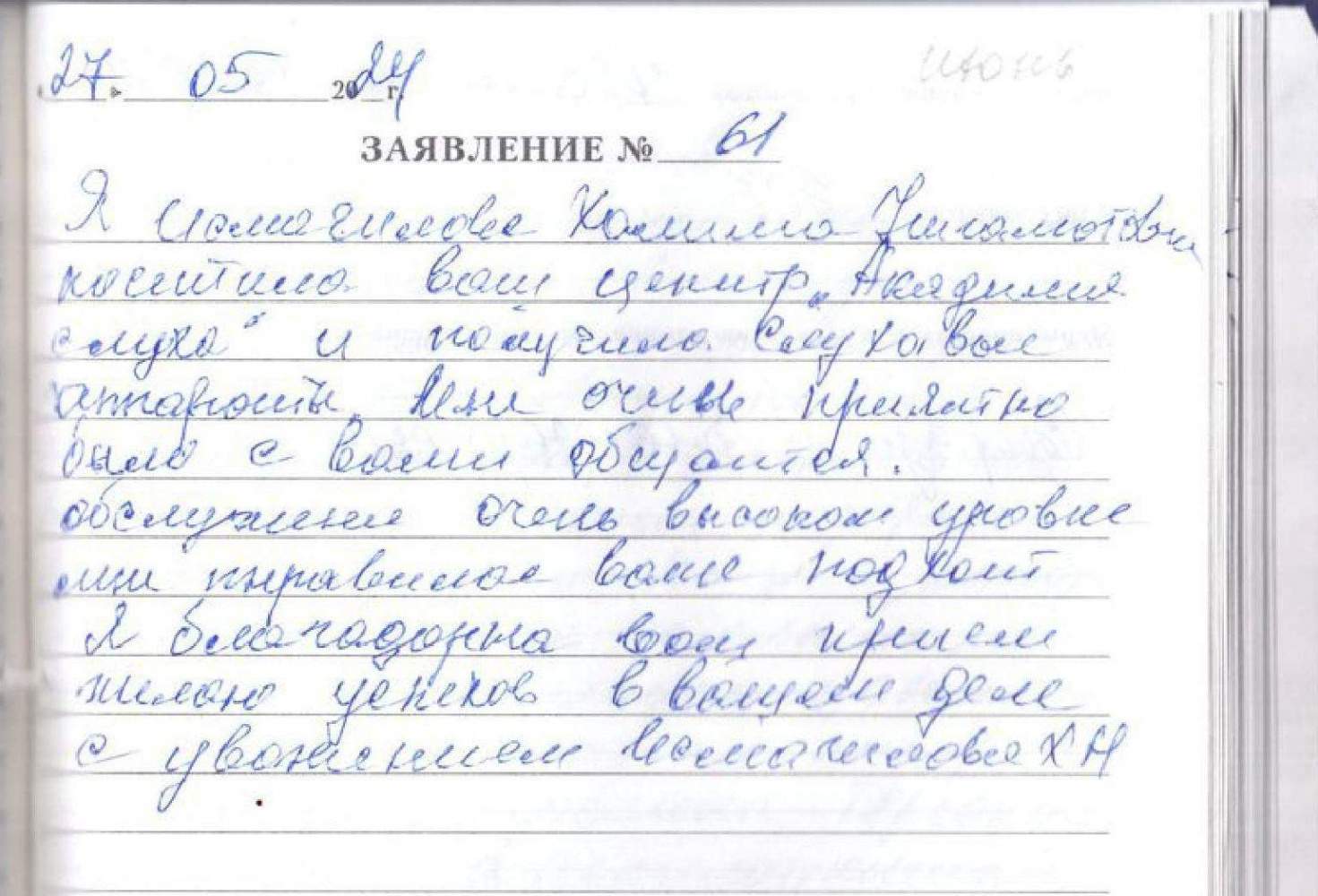 Я Исмагилова Халима Нигаматовна посетила ваш центр "Академия слуха" и получила слуховые аппараты. Мне очень приятно было с вами общаться. Обслужили на очень высоком уровне. Мне понравился ваш подход. Я благодарна вам за приём. Желаю успехов в вашем деле. С уважением Исмагилова Х.Н.
