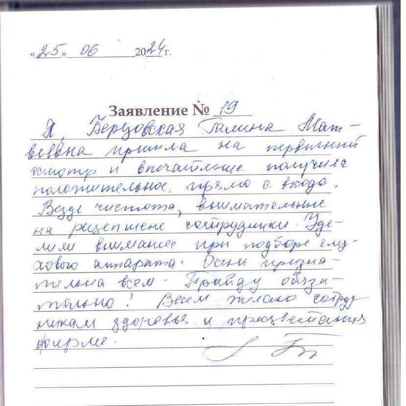 Я, Березовская Галина Матвеевна, пришла на первичный осмотр и впечатление получила положительное прямо с входа. Везде чистота, внимательные на ресепшене сотрудники. уделили внимание при бодборе слухового аппарата .Очень признательна всем. Приду обязательно! Всем желаю сотрудникам здоровья и процветания фирмы.