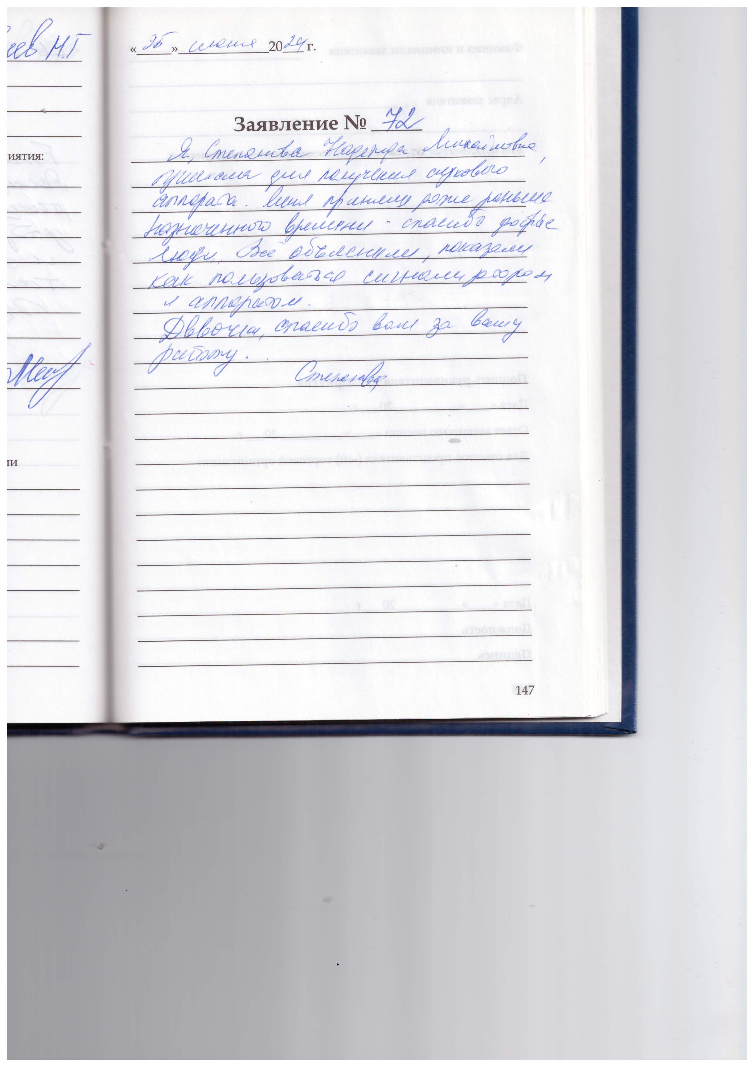 Я, Степанова Надежда Михайловна , приехала для получения слухового аппарата. Меня приняли даже раньше назначенного времени – спасибо добрые люди. Всё объяснили показали как пользоваться сигнализатором и аппаратом.