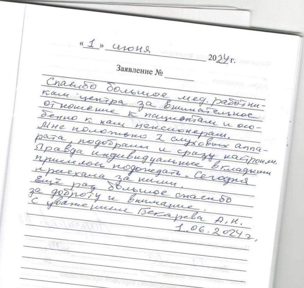 Спасибо большое мед.работникам центра за внимательное отношение к нам пенсионерам. Мне положено 2 слуховых аппарата,подобрали м сразу настроили.Правда индивидуальные вкладыши пришлось подождать.Сегодня приехала за ними.