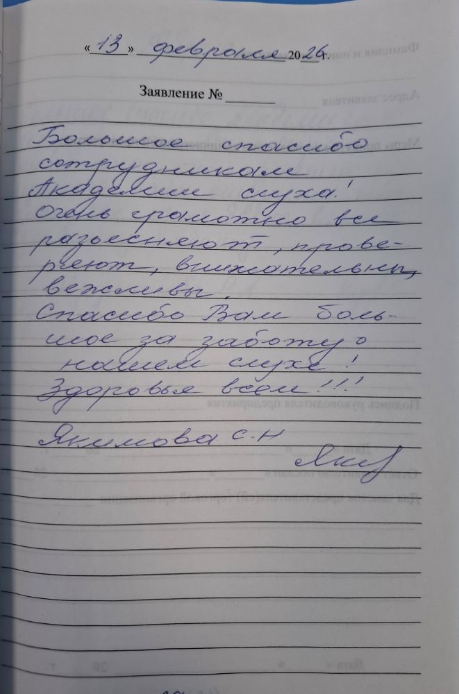 Большое спасибо сотрудникам Академии Слуха! Очень грамотно всё разъясняют, проверяют, внимательны, вежливы. Спасибо вам большое за заботу о нашем слухе! Здоровья всем!!!