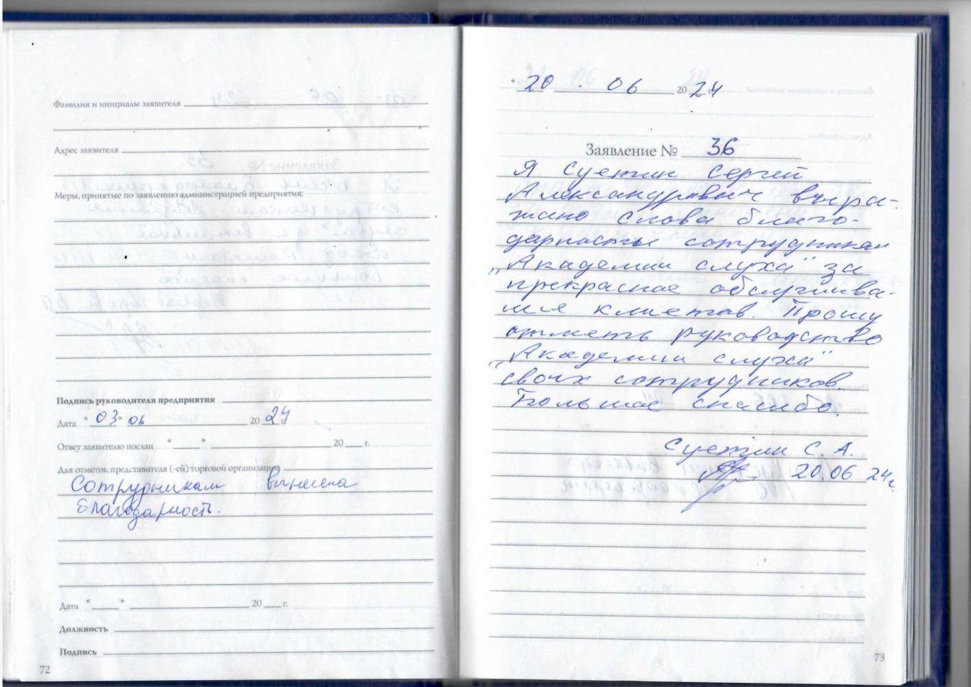 Я, Суетин Сергей Александрович выражаю слова благодарности сотрудникам «Академии слуха» за прекрасное обслуживание клиентов. Прошу отметить руководство своих сотрудников . Большое спасибо