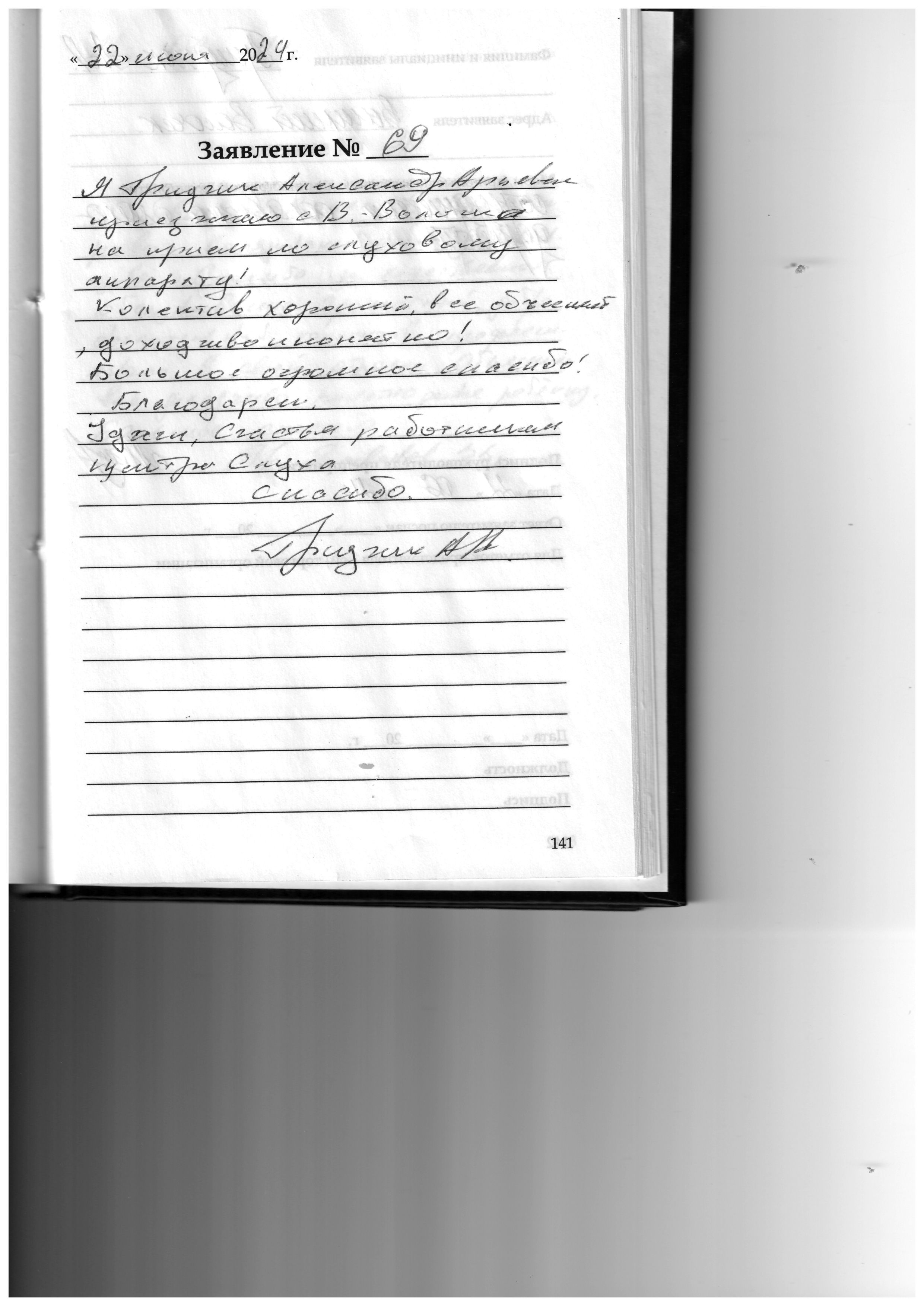 Я, Гридчик Александр Арьевич, приезжаю с Вышнего Волочка на прием по слуховому аппарату! Коллектив хороший, всё объяснили, доходчиво и понятно! Большое огромное спасибо! Благодарим. Удачи, счастья работникам Центра Слуха. Спасибо.
