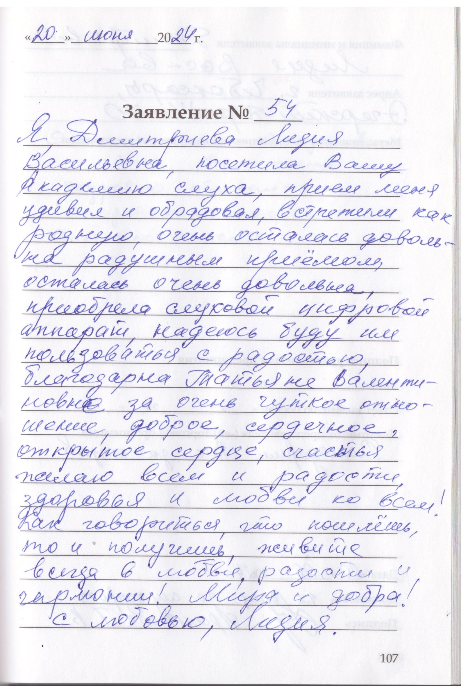 Я, Дмитриева Лидия Васильевна, посетила Вашу Академию слуха, прием меня удивил и обрадовал, встретили как родную, очень осталась довольна радушным приемом, осталась очень довольна, приобрела слуховой цифровой аппарат, надеюсь буду им пользоваться с радостью, благодарна Татьяне Валентиновне за очень чуткое отношение, доброе, сердечное, открытое сердце, счастья желаю всем и радости, здоровья и любви ко всем! Как говориться, что пошлёшь, то и получишь, живите всегда в любви, радости и гармонии! Мира и добра!