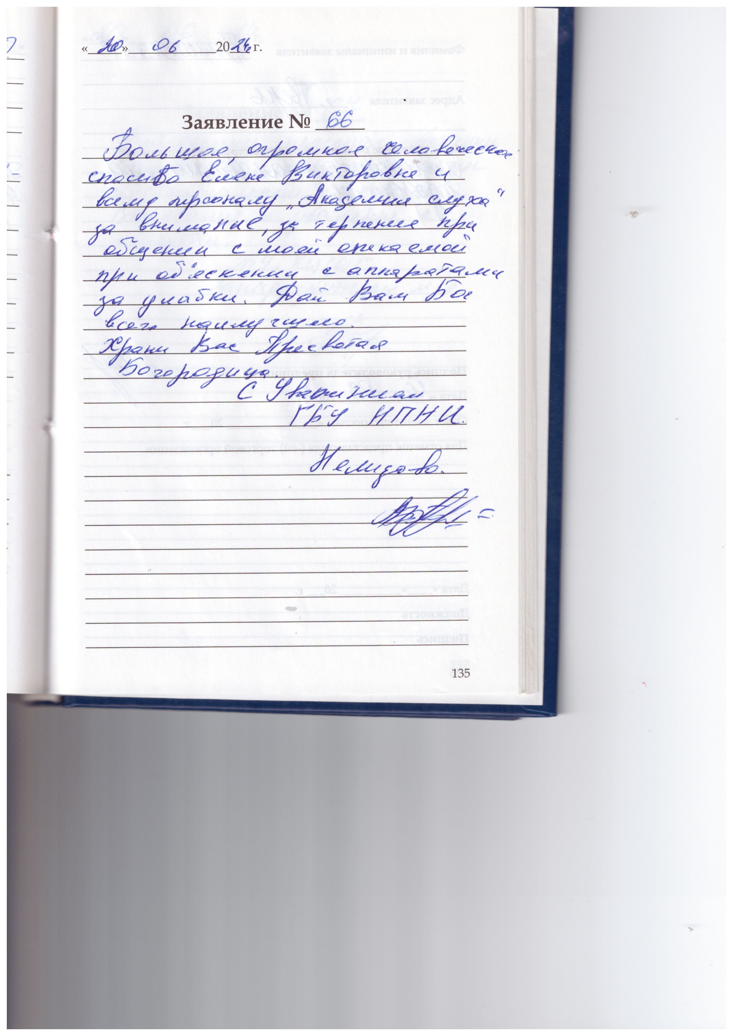 Большое, огромное человеческое спасибо Елене Викторовне и всему персоналу «Академии слуха» за внимание, за терпение при общении с моей опекаемой при объяснении с аппаратами за улыбки. Дай Вам Бог всего наилучшего. Храни Вас Пресвятая Богородица. С уважением ГБУ НПНИ Нелидово.